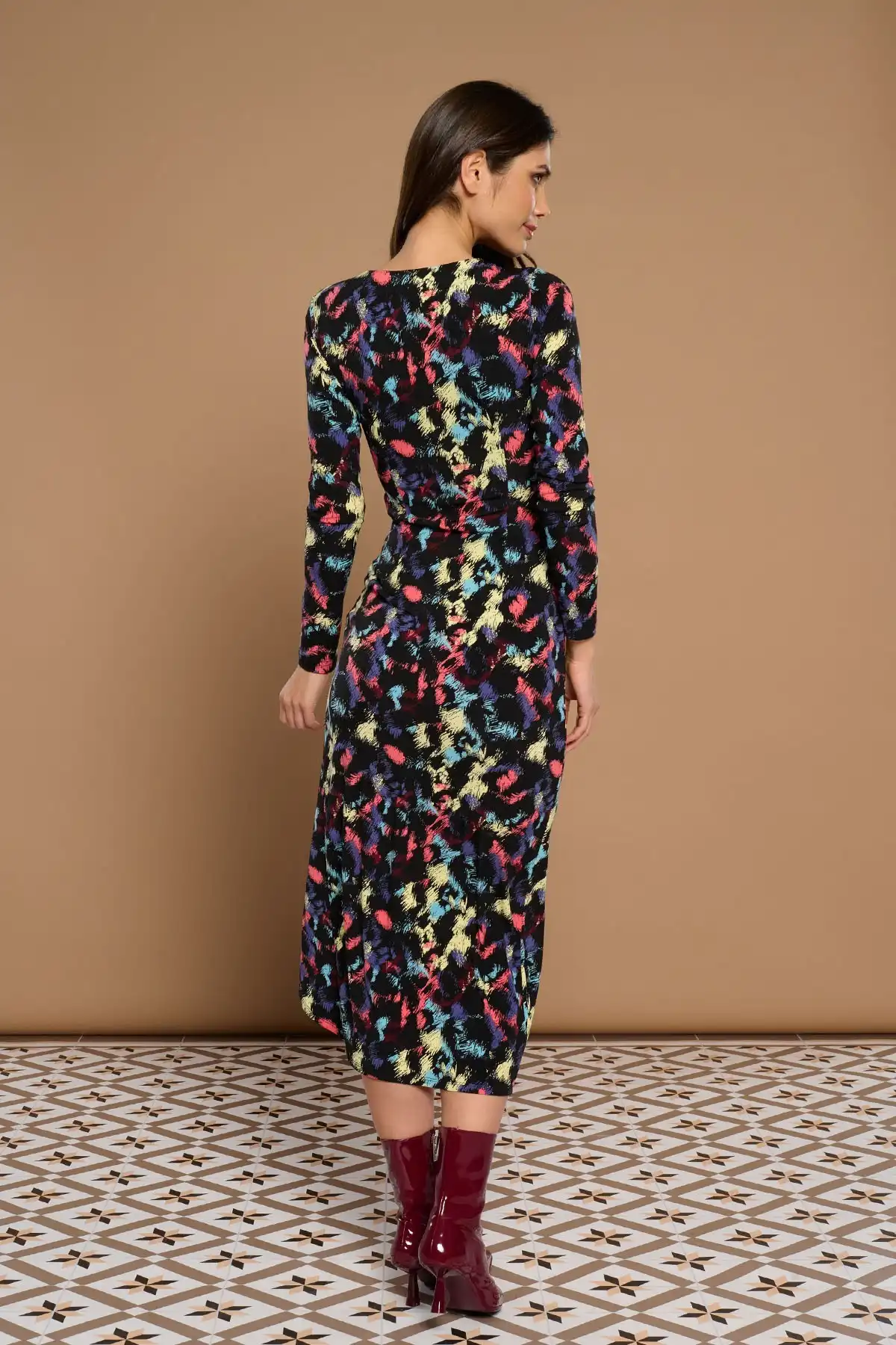 Midi φόρεμα με στρογγυλή λαιμόκοψη και μακριά μανίκια.