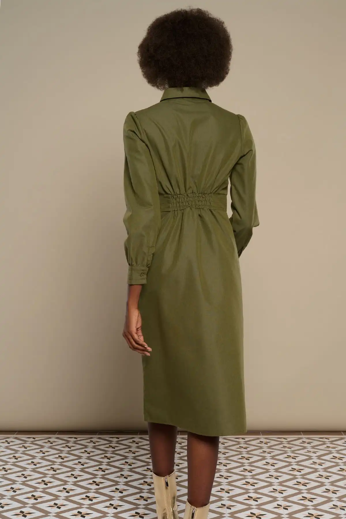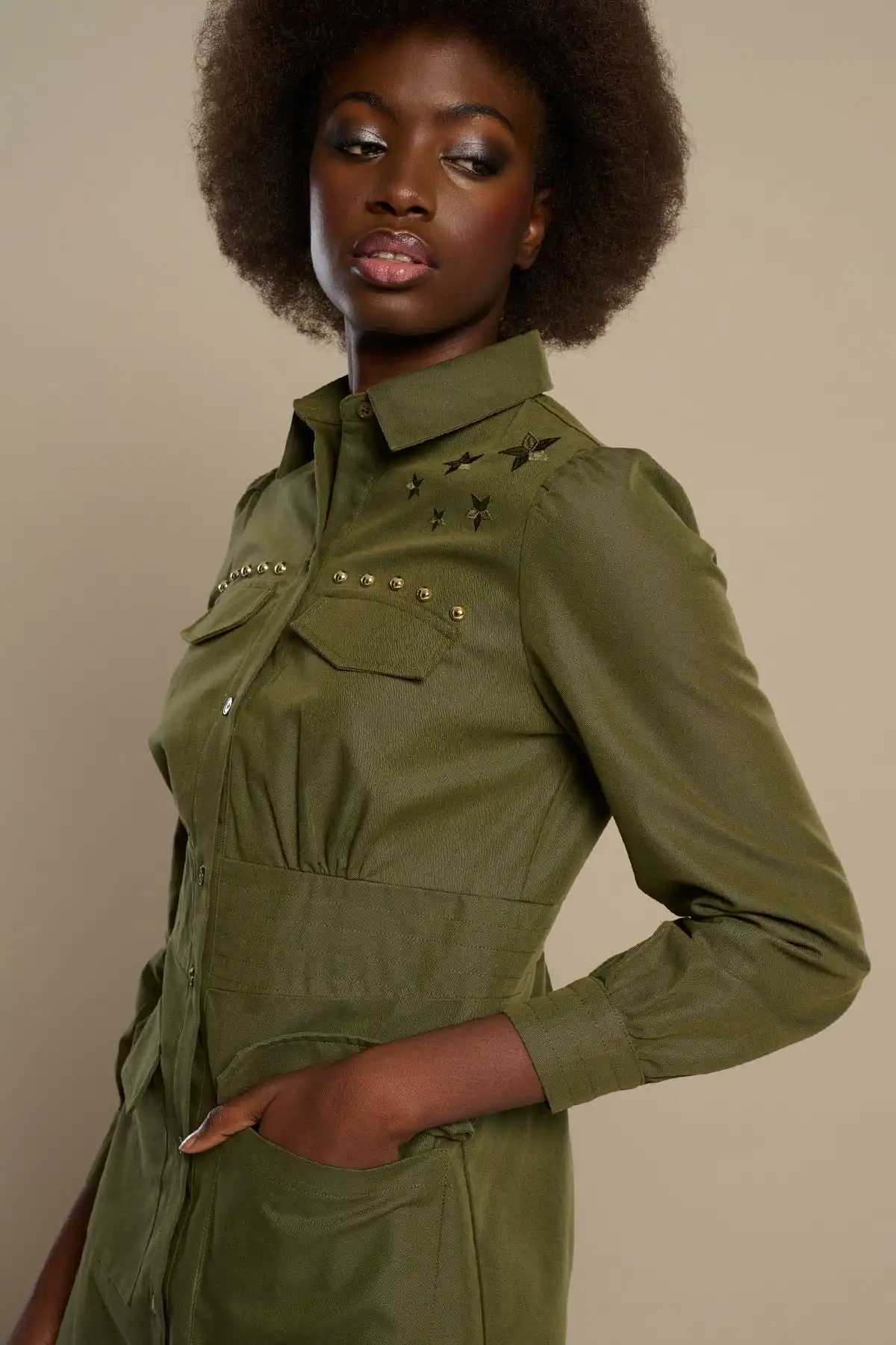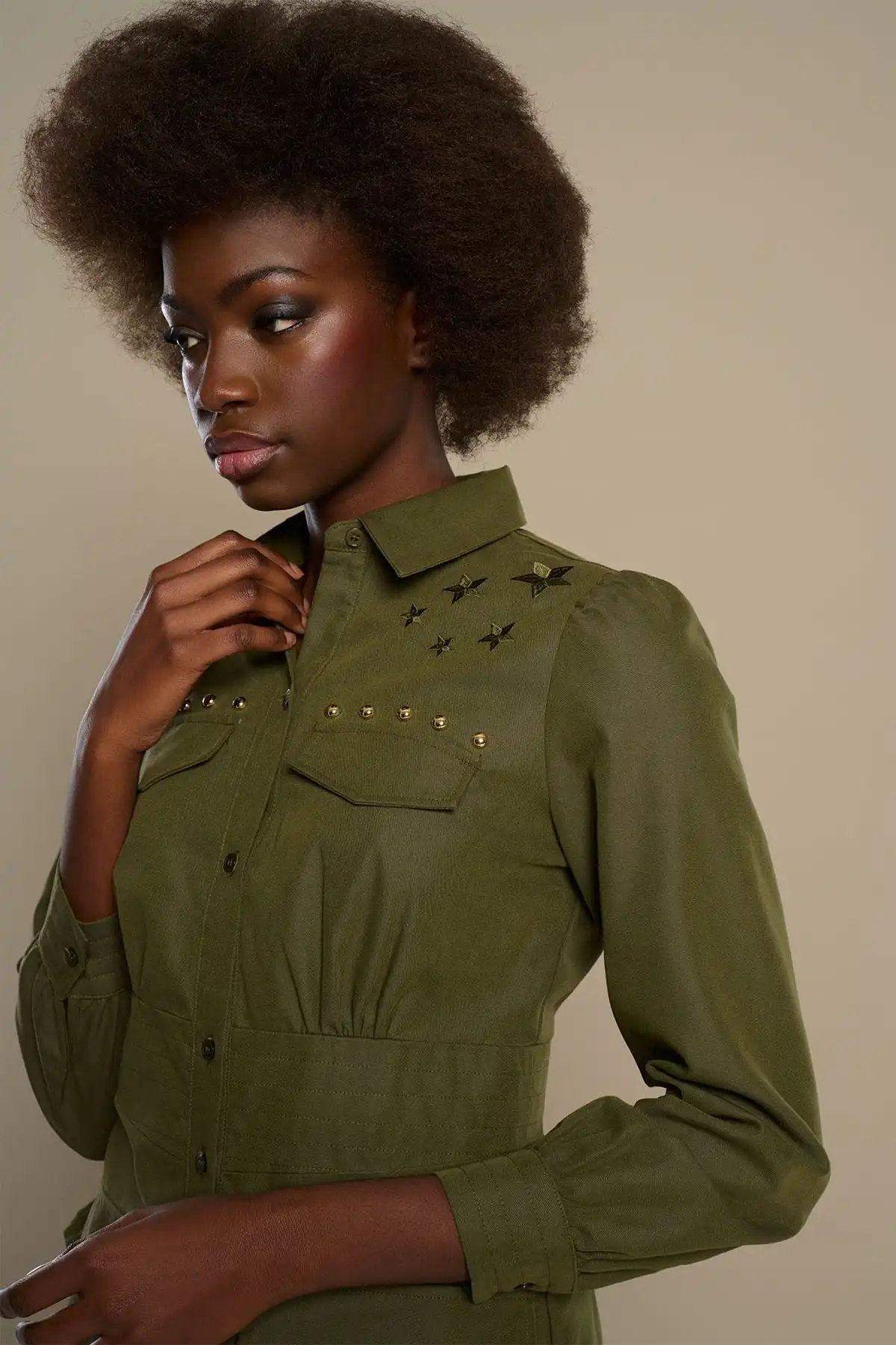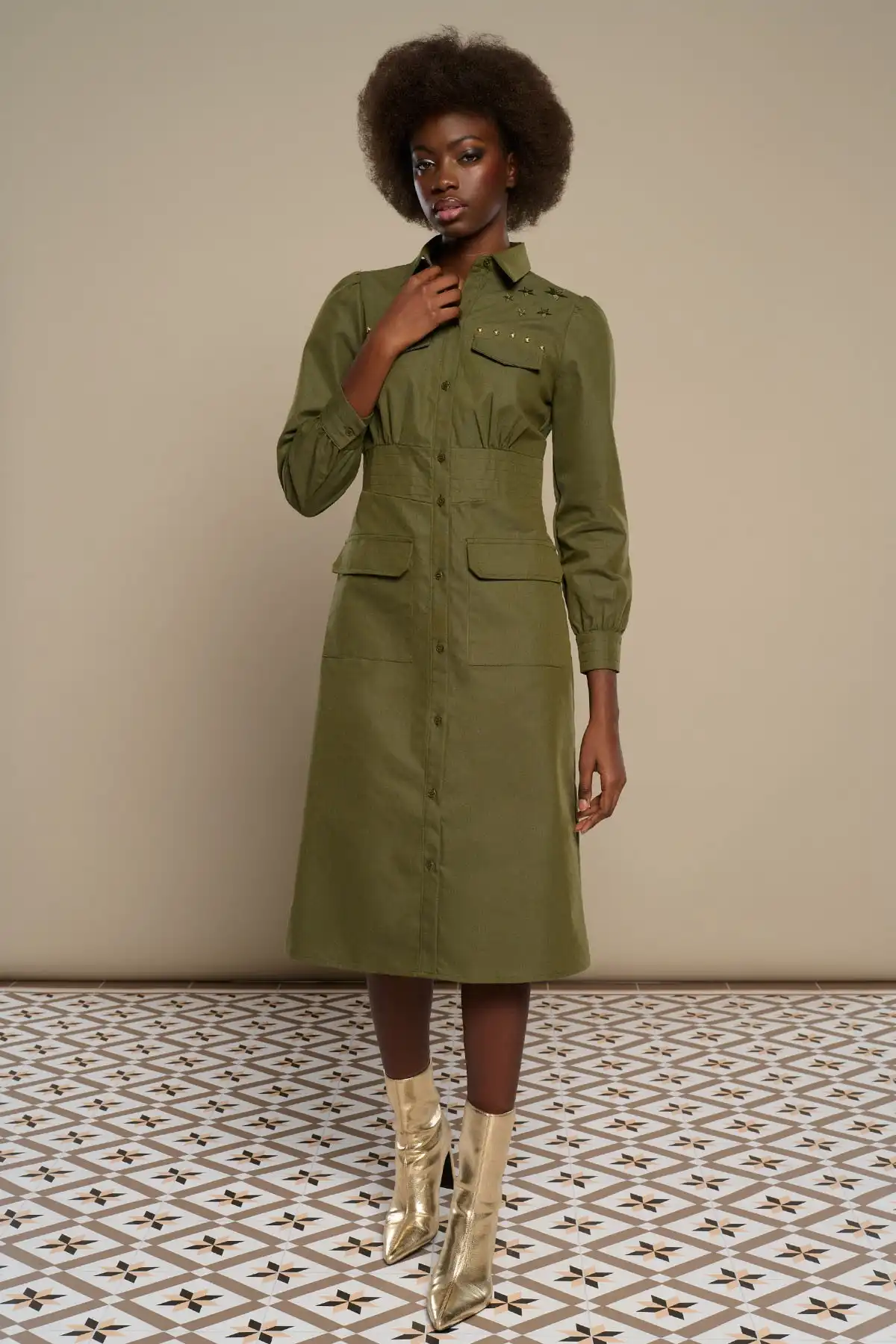 Φόρεμα στρατιωτικού στυλ από βαμβάκι με γιακά τύπου πέτο και μακριά μανίκια.