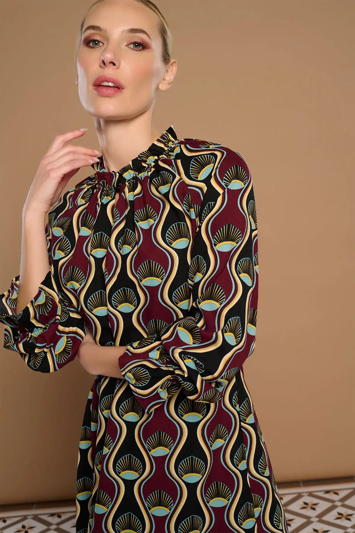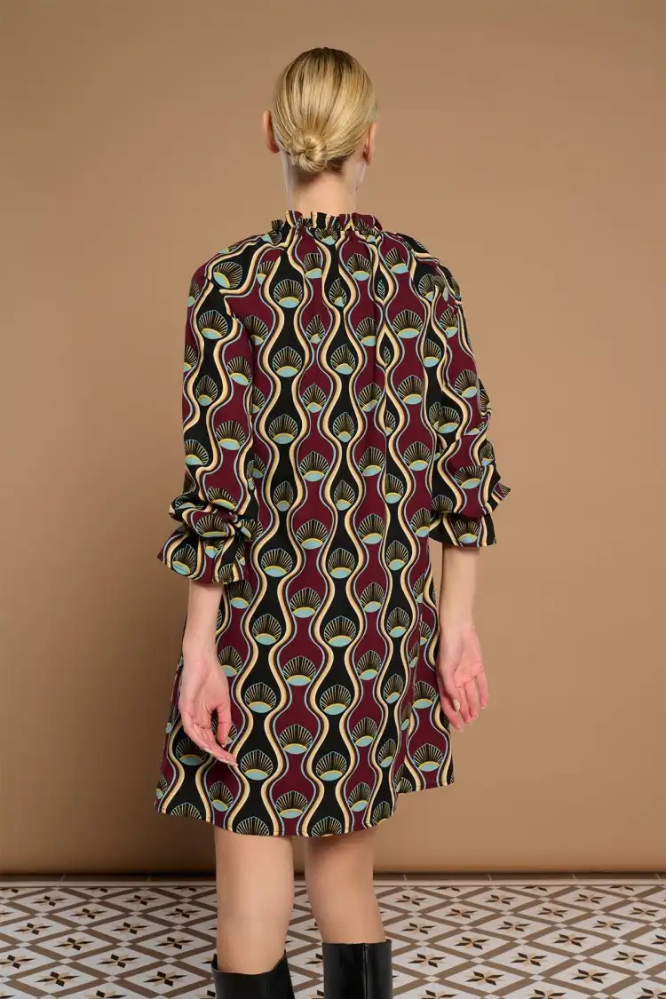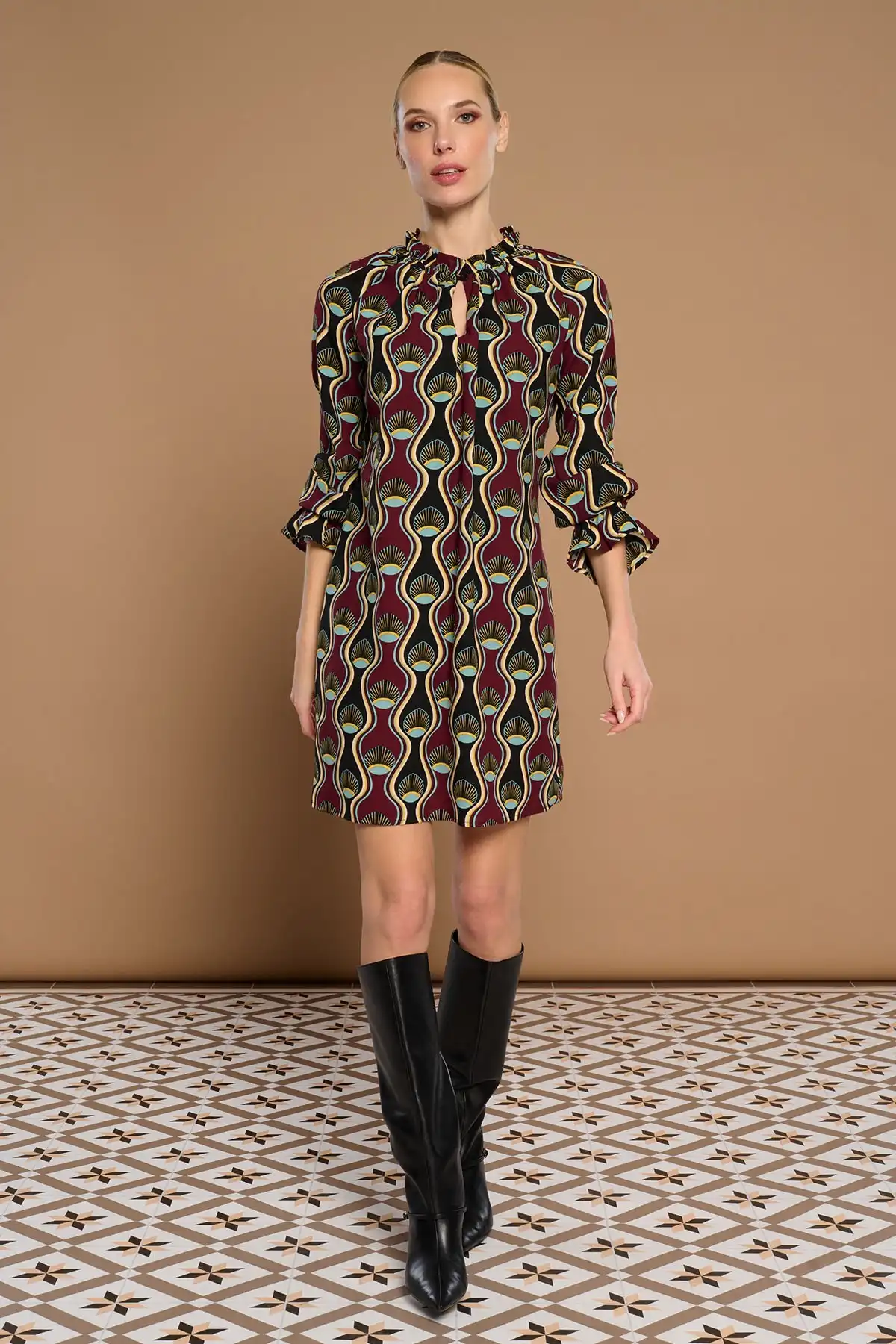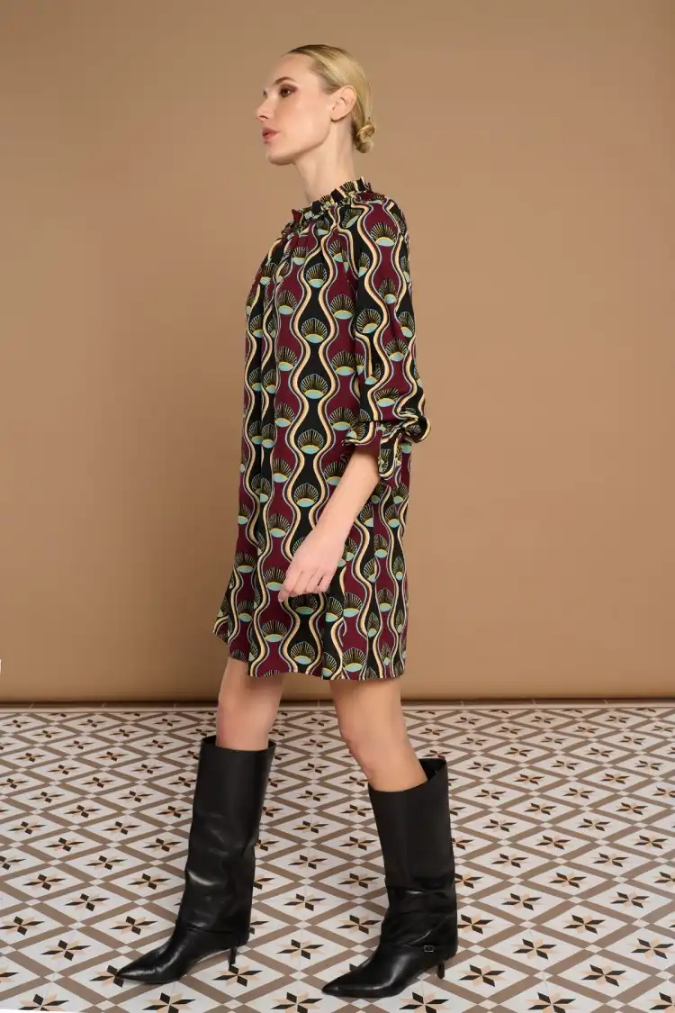 Κοντό φόρεμα με εμπριμέ σχέδιο γεωμετρικών μοτίβων σε τόνους μπορντό, μαύρου, χρυσού και πράσινου.