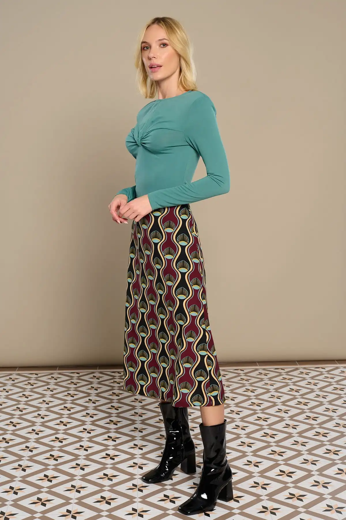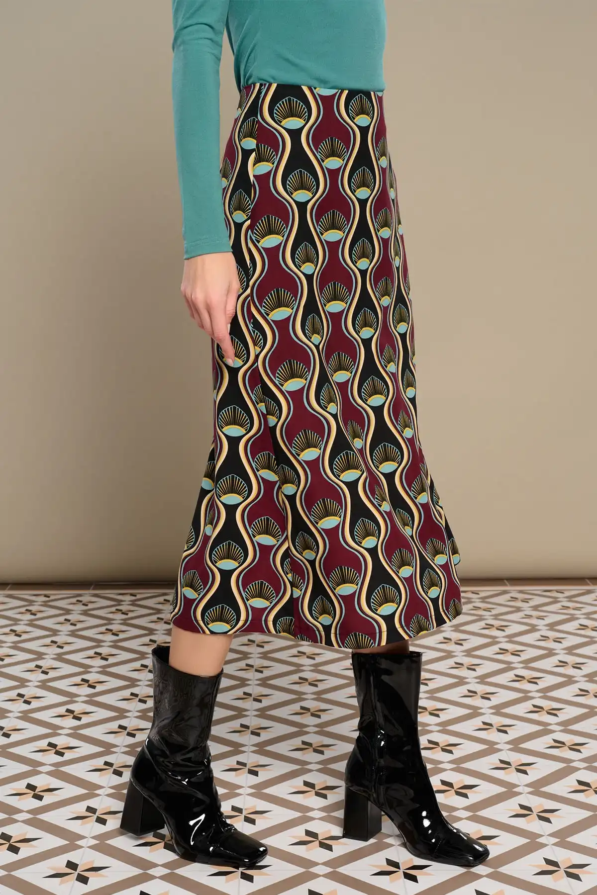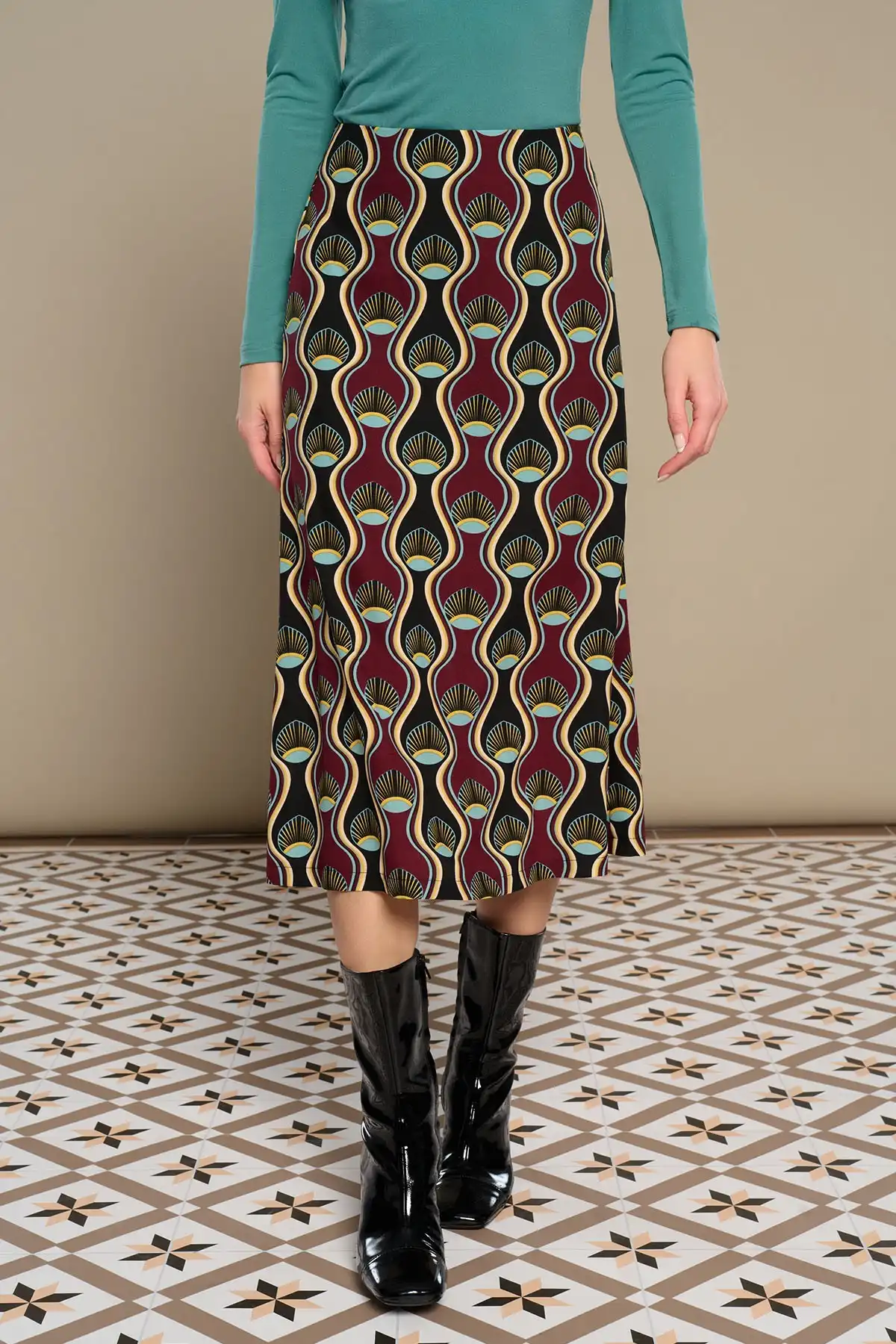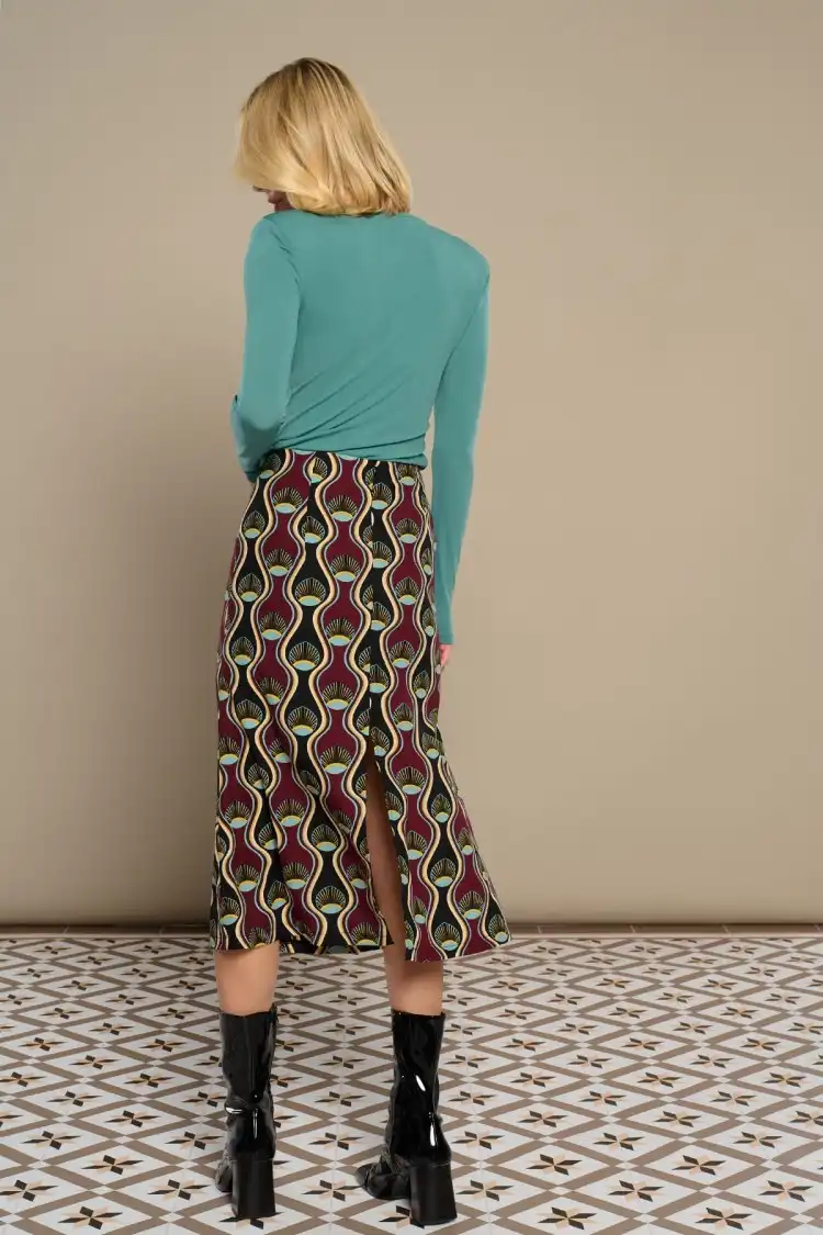 Midi φούστα με ψηλή μέση και γεωμετρικά σχέδια σε τόνους μπορντό, μαύρου, χρυσού και πράσινου.