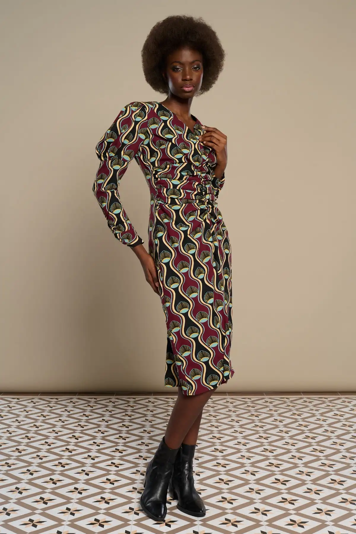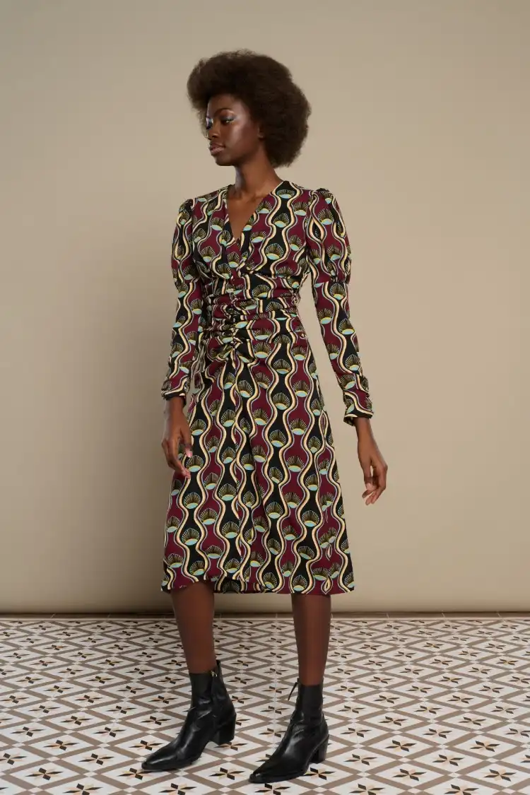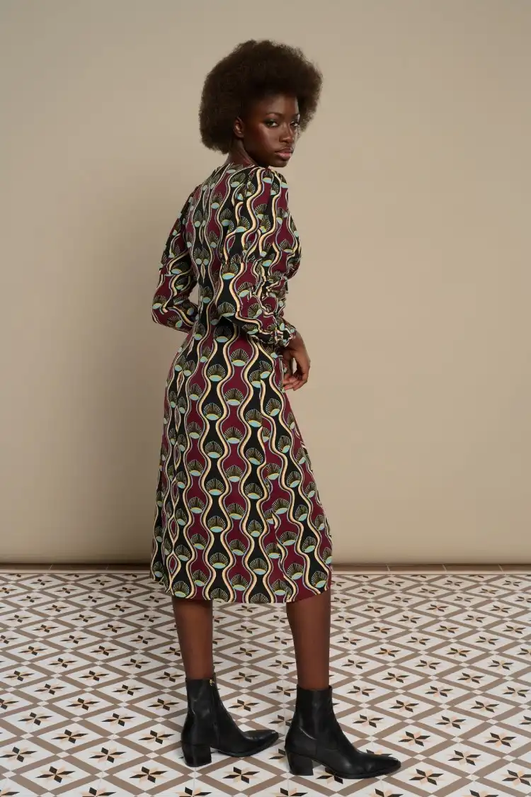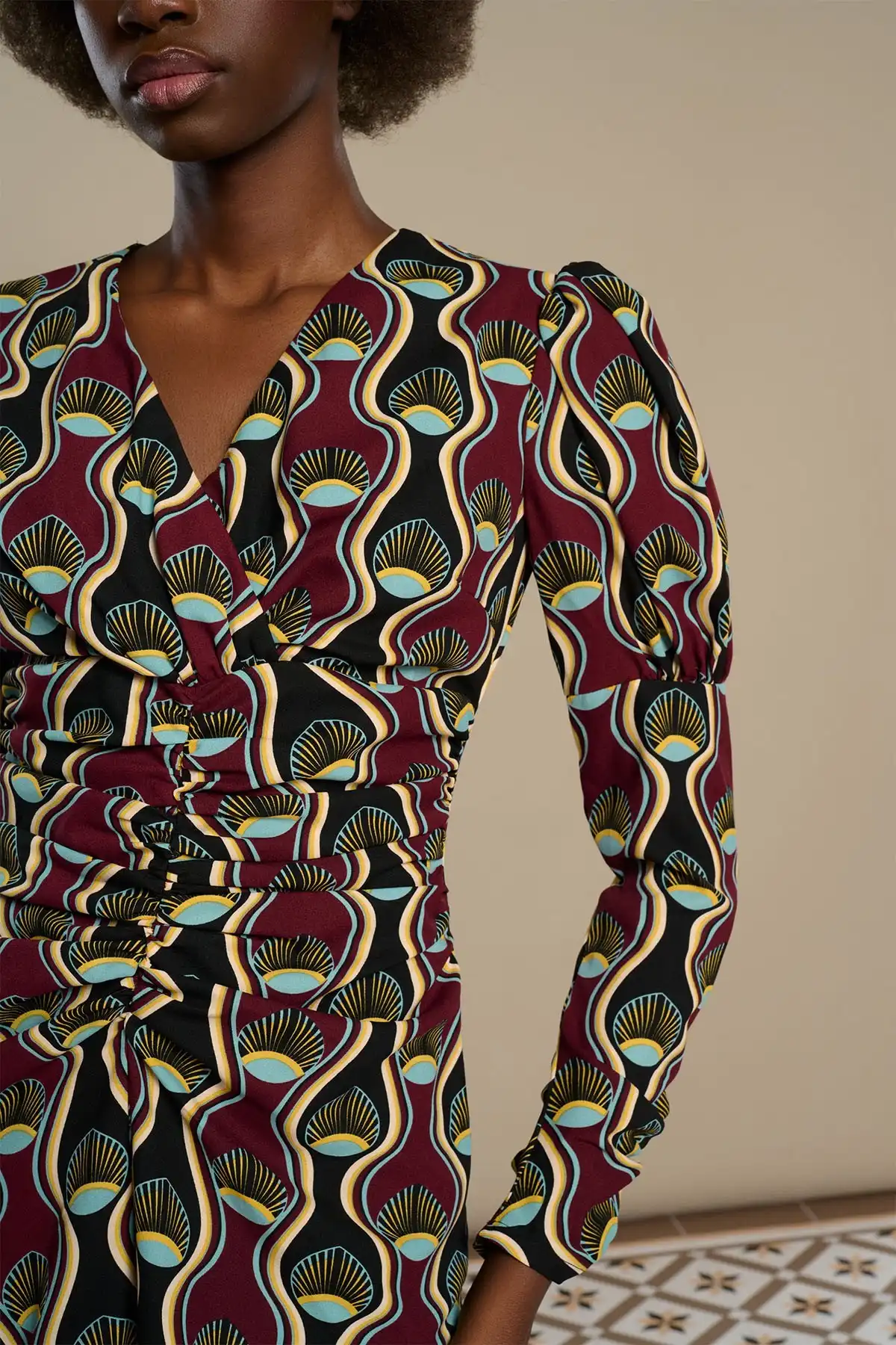 Εμπριμέ σχέδιο με γεωμετρικά μοτίβα σε τόνους μπορντό, μαύρου, χρυσού και πράσινου.