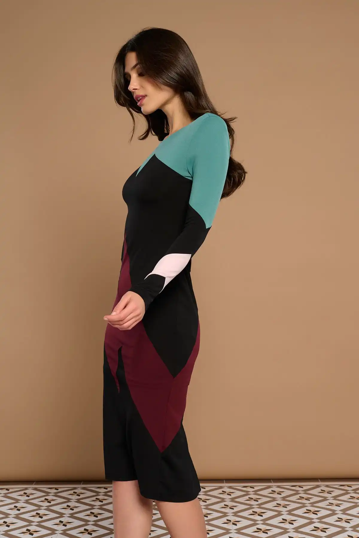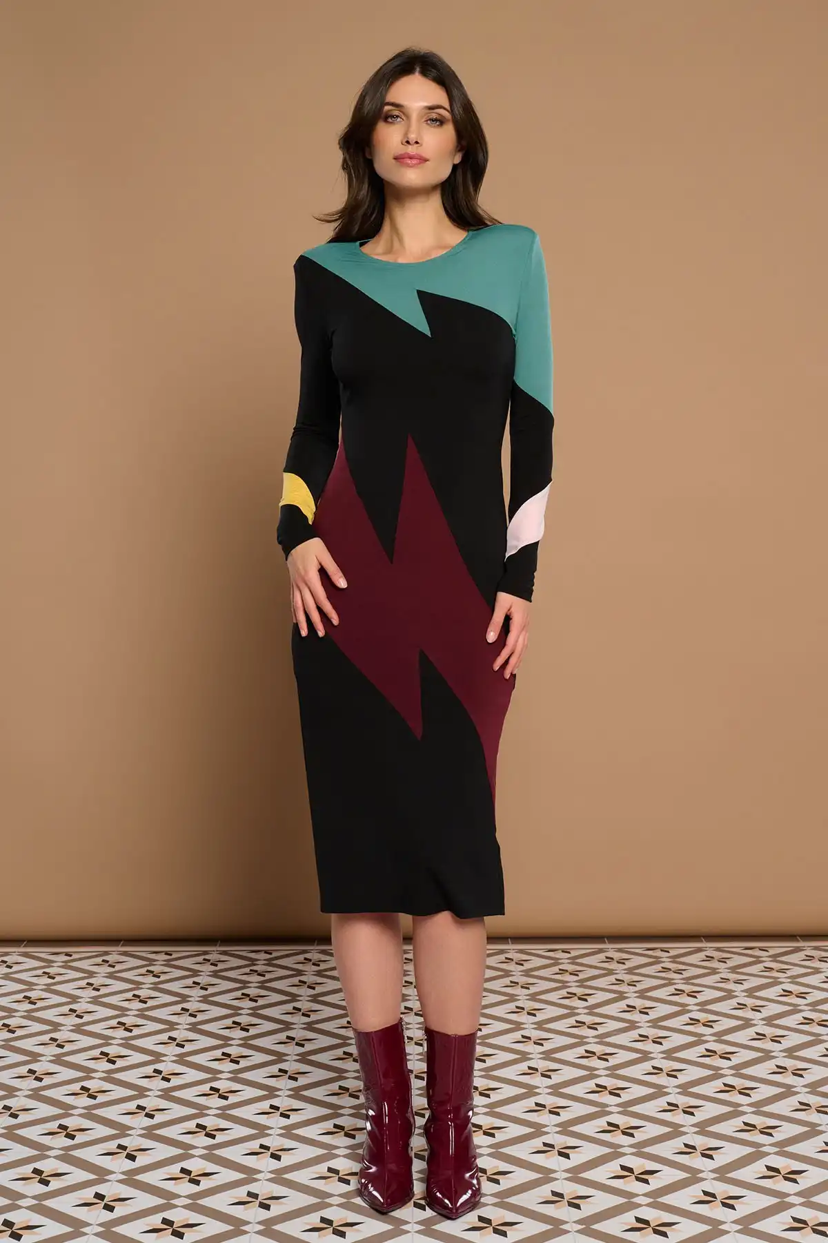 Midi φόρεμα με στρογγυλή λαιμόκοψη και μακριά μανίκια.