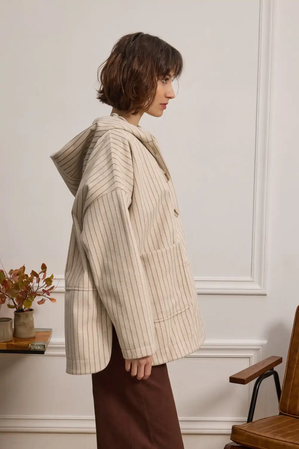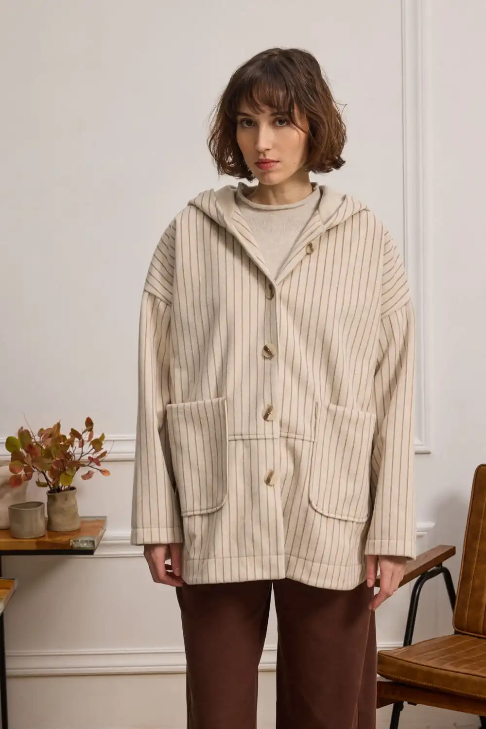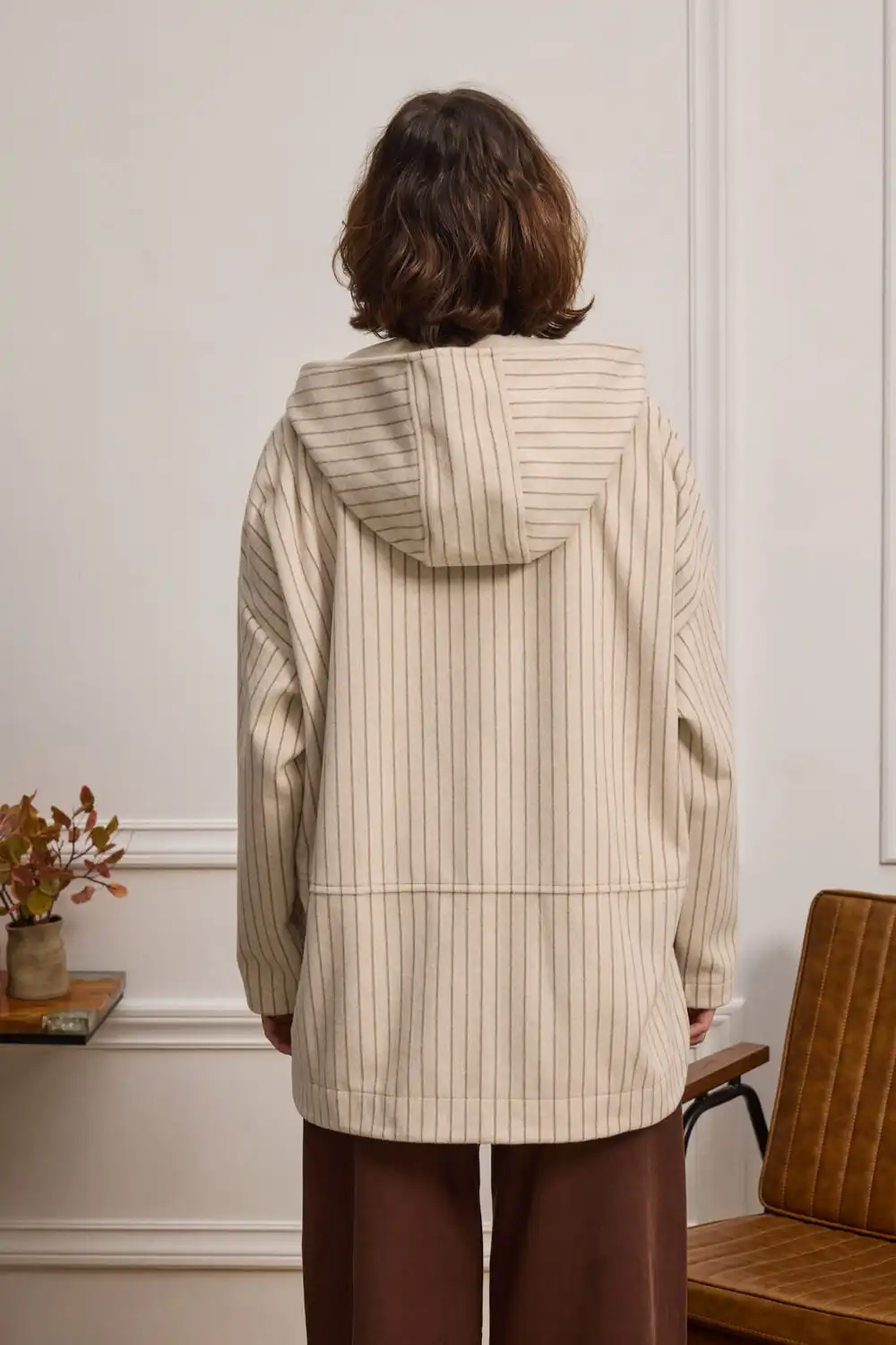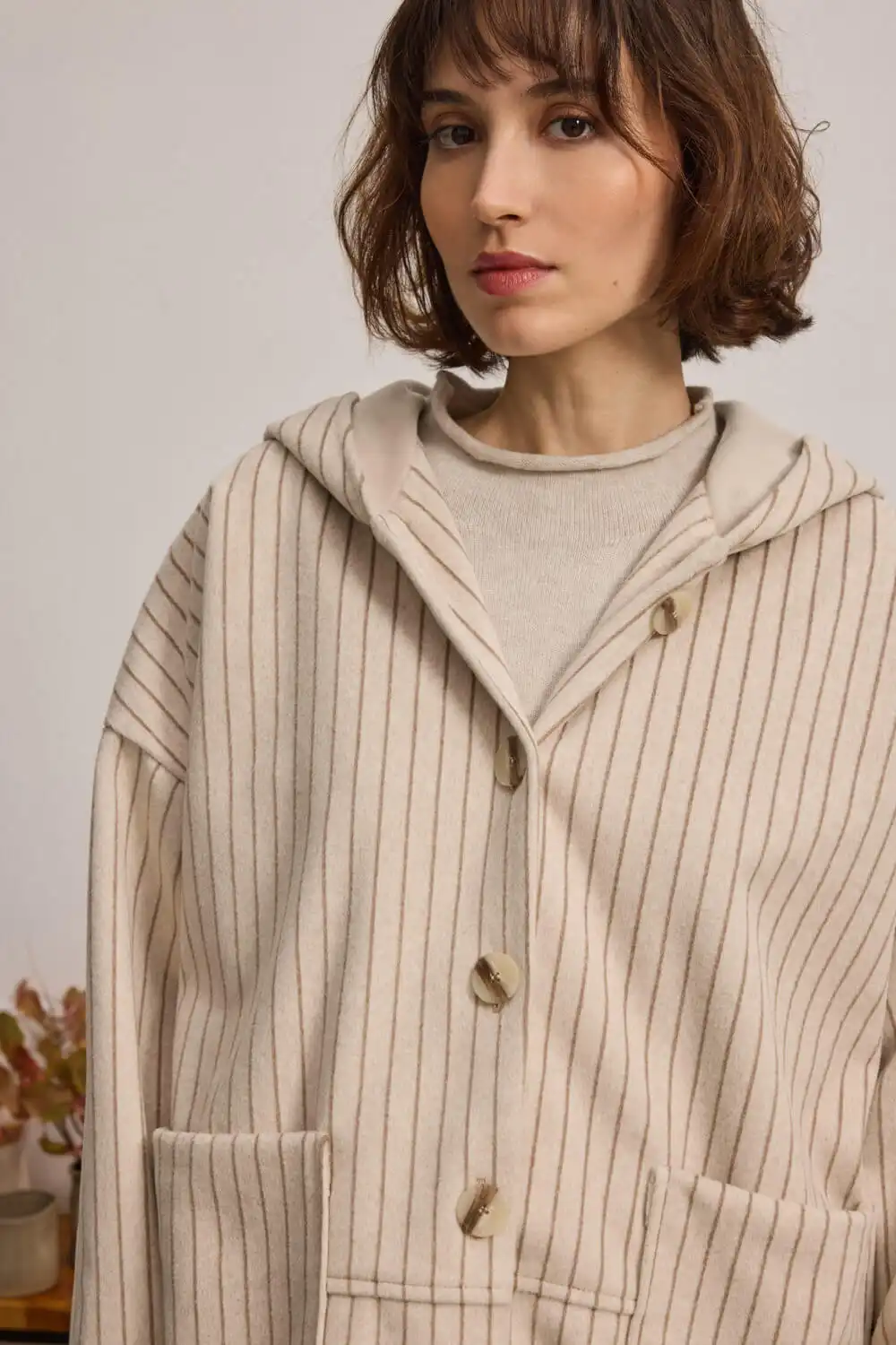 Πανωφόρι με απαλή, χνουδωτή υφή και ριγέ μοτίβο που προσδίδει ρυθμό και προσωπικότητα στο look. Διαθέτει κουκούλα με φόδρα, μακριά μανίκια με χαμηλωμένους ώμους και στρογγυλεμένο τελείωμα με διακριτικά ανοίγματα στα πλάγια. Το μήκος είναι κανονικό, ενώ οι τετράγωνες τσέπες μπροστά συνδυάζουν πρακτικότητα με στυλ. Το κλείσιμο με κουμπιά ολοκληρώνει το κομμάτι, καθιστώντας το ιδανικό για άνετες και μοντέρνες εμφανίσεις με διακριτικό twist.