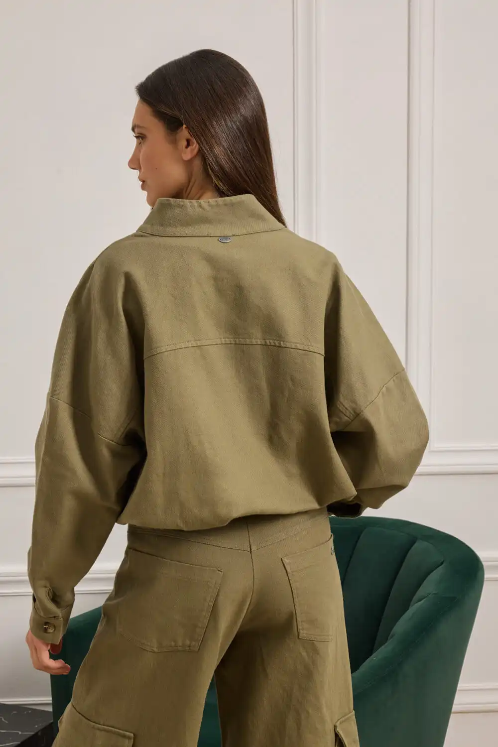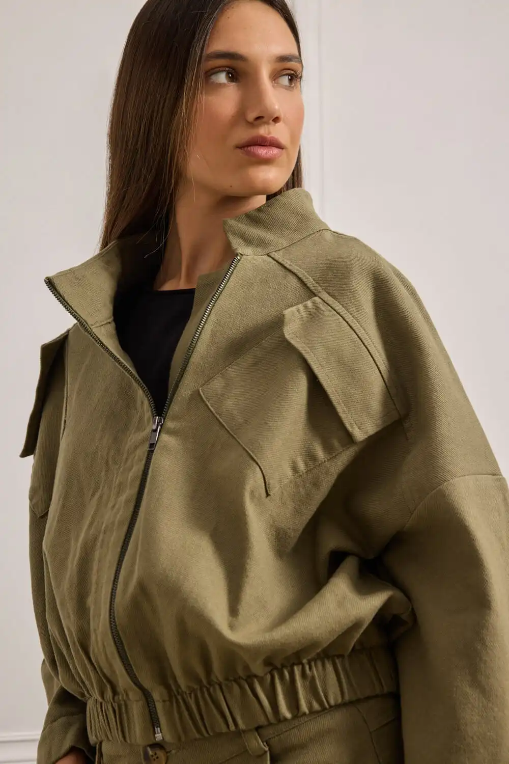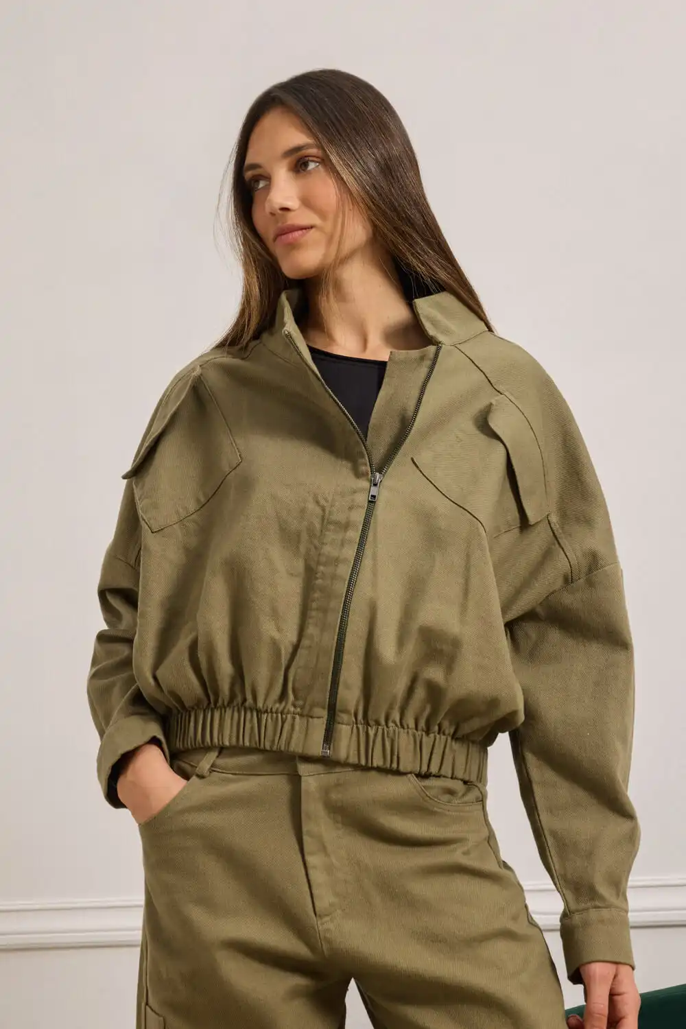 Jacket με μοναδικό design και άψογη ραφή. Κατασκευασμένο από 100% βαμβάκι, εξασφαλίζει άνεση και φυσική αίσθηση στο δέρμα. Διαθέτει μακριά μανίκια με μανσέτες για σταθερή εφαρμογή, ενώ οι λοξές γραμμές και οι τσέπες με καπάκι προσδίδουν διακριτικό, αλλά ξεχωριστό στιλ. Το λοξό κλείσιμο με μεταλλικό φερμουάρ προσφέρει μοντέρνα λεπτομέρεια, ενώ ο φαρδύς όρθιος γιακάς ολοκληρώνει το ιδιαίτερο look. Το εσωτερικό λάστιχο στο τελείωμα δημιουργεί σιλουέτα τύπου bomber, συνδυάζοντας military αισθητική με casual κομψότητα.