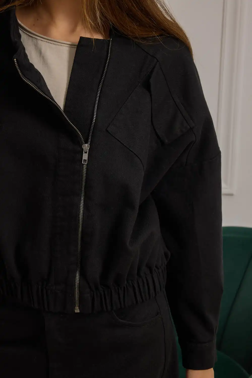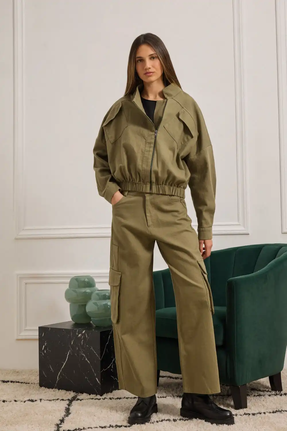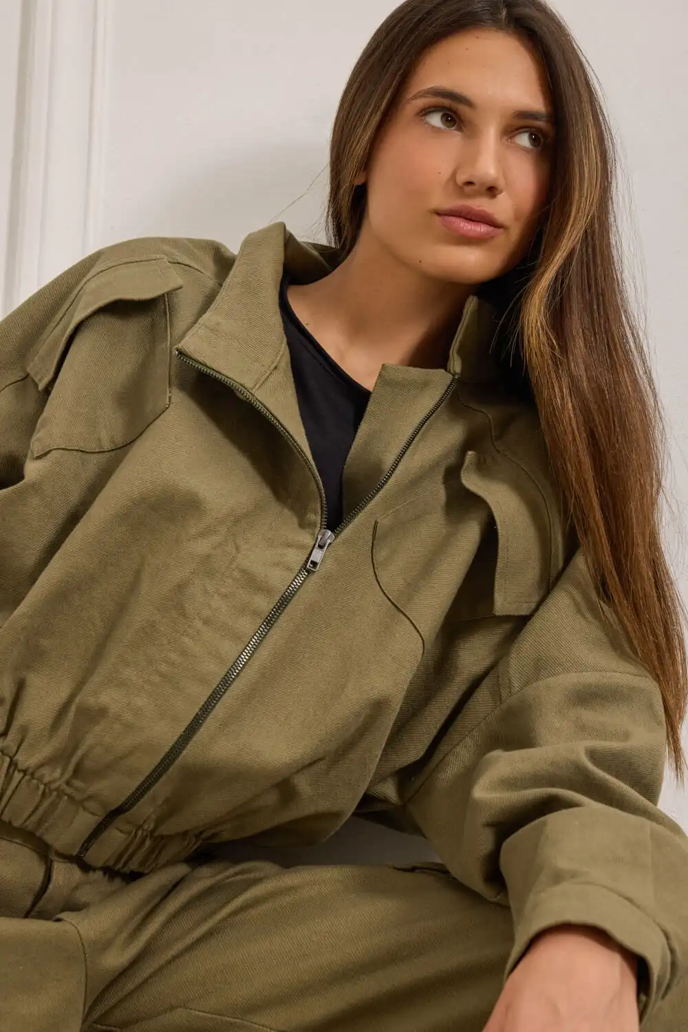 Jacket με μοναδικό design και άψογη ραφή. Κατασκευασμένο από 100% βαμβάκι, εξασφαλίζει άνεση και φυσική αίσθηση στο δέρμα. Διαθέτει μακριά μανίκια με μανσέτες για σταθερή εφαρμογή, ενώ οι λοξές γραμμές και οι τσέπες με καπάκι προσδίδουν διακριτικό, αλλά ξεχωριστό στιλ. Το λοξό κλείσιμο με μεταλλικό φερμουάρ προσφέρει μοντέρνα λεπτομέρεια, ενώ ο φαρδύς όρθιος γιακάς ολοκληρώνει το ιδιαίτερο look. Το εσωτερικό λάστιχο στο τελείωμα δημιουργεί σιλουέτα τύπου bomber, συνδυάζοντας military αισθητική με casual κομψότητα.
