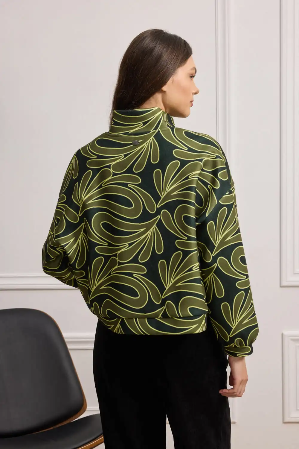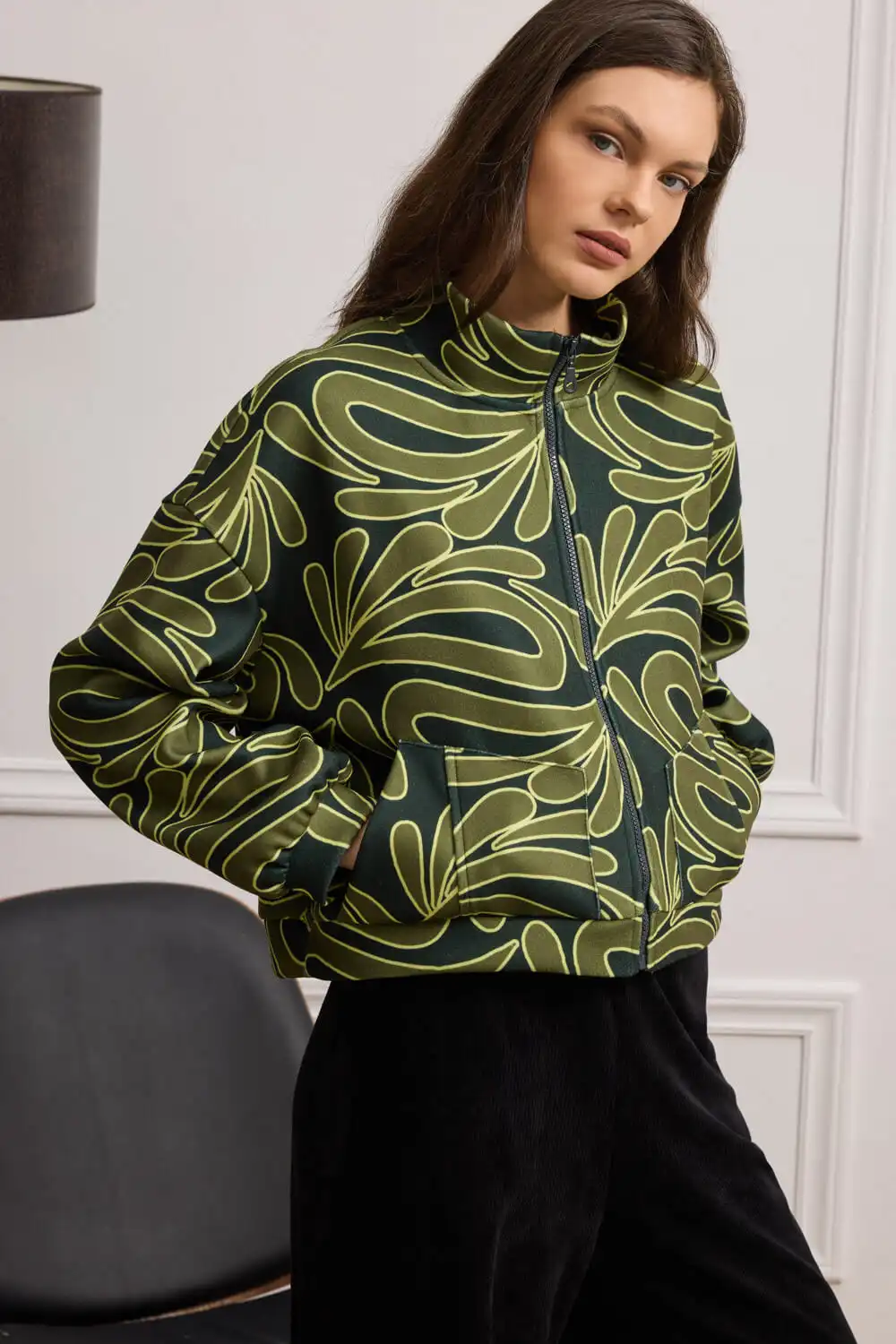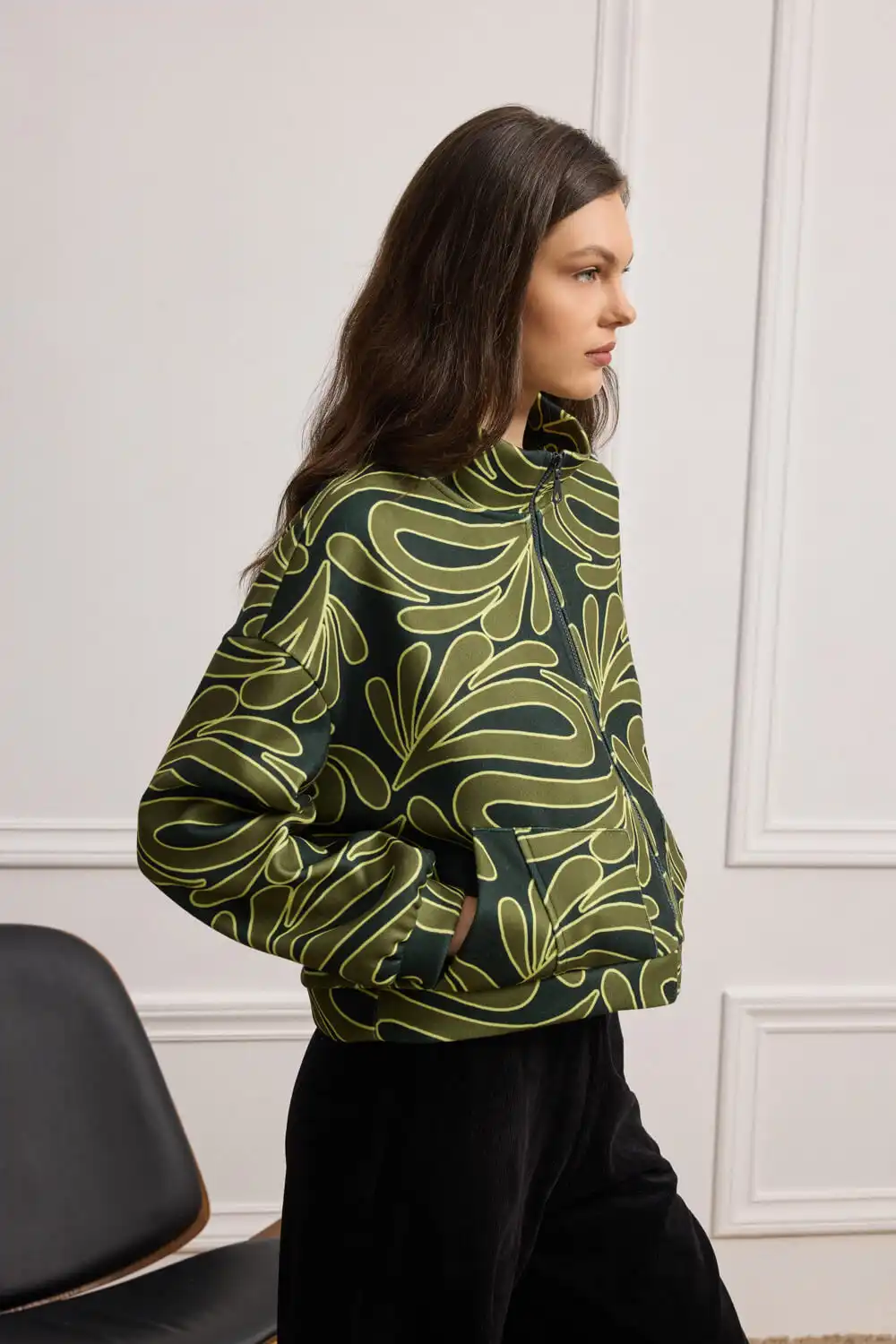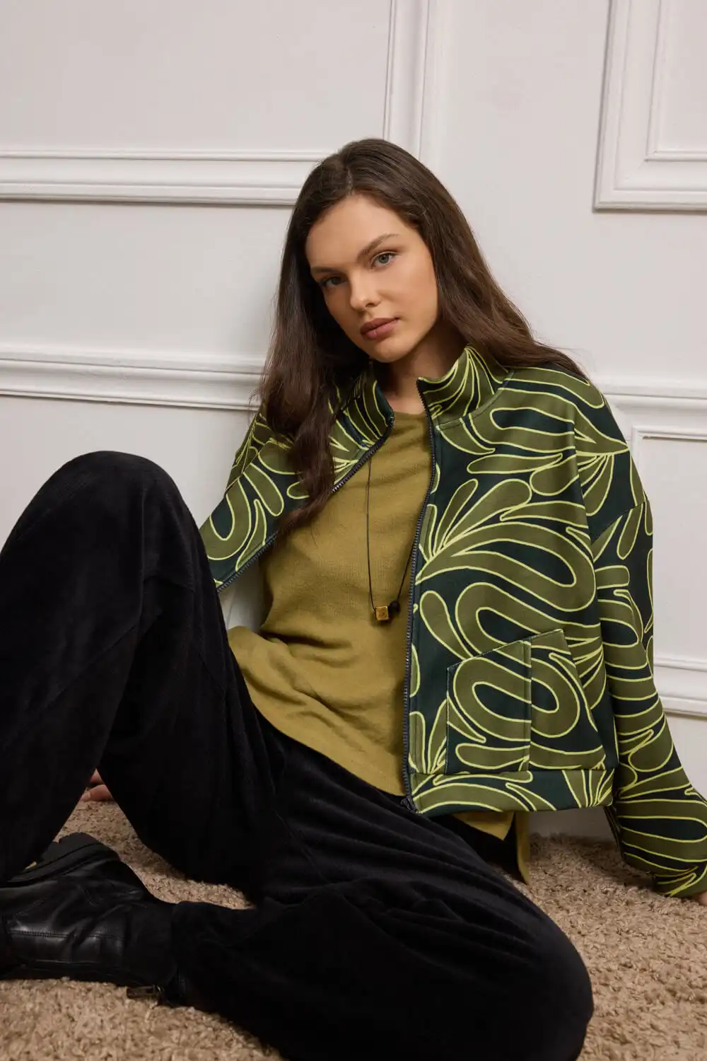 Μπουφάν με καθαρή σχεδιαστική ταυτότητα, κατασκευασμένο από χοντρό ζέρσεϊ ύφασμα, που ξεχωρίζει για το αφαιρετικό print, προσδίδοντας ενέργεια και χαρακτήρα σε κάθε εμφάνιση. Η χαλαρή γραμμή με ήπια καμπυλότητα στη βάση προσφέρει άνεση και σύγχρονο στυλ. Ο ψηλός γιακάς πλαισιώνει εντυπωσιακά το πρόσωπο, ενώ οι σχεδιαστικές ραφές στις τσέπες ενισχύουν τη γραμμικότητα του σχεδίου. Το μπροστινό φερμουάρ εξασφαλίζει πρακτικότητα, ενώ η φάσα με σούρα στα μανίκια προσθέτει όγκο και ιδιαίτερο στιλιστικό twist.