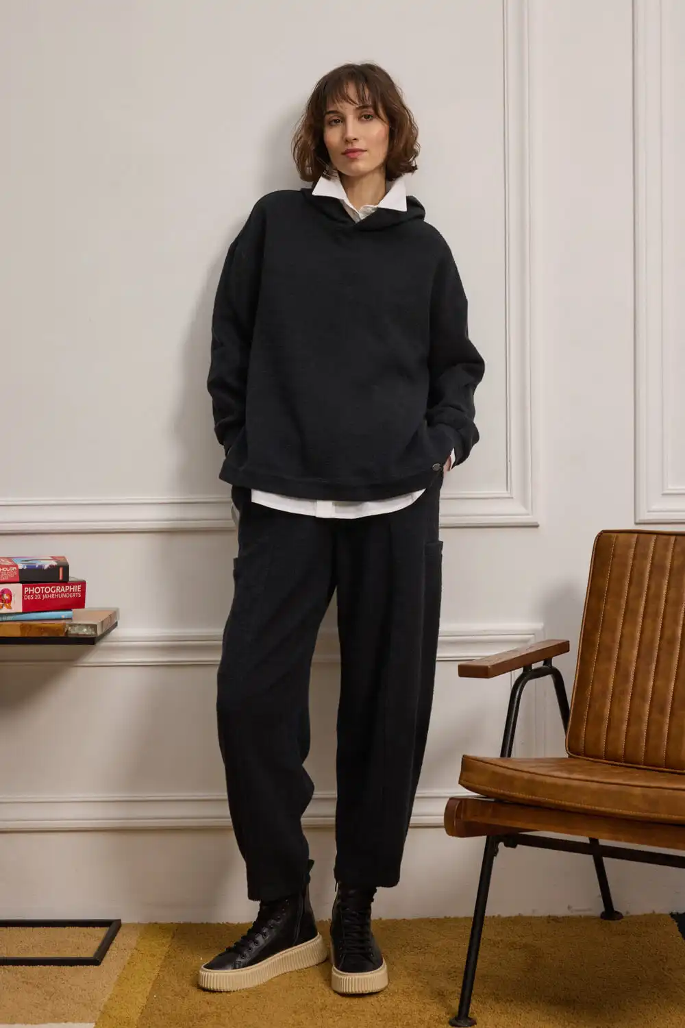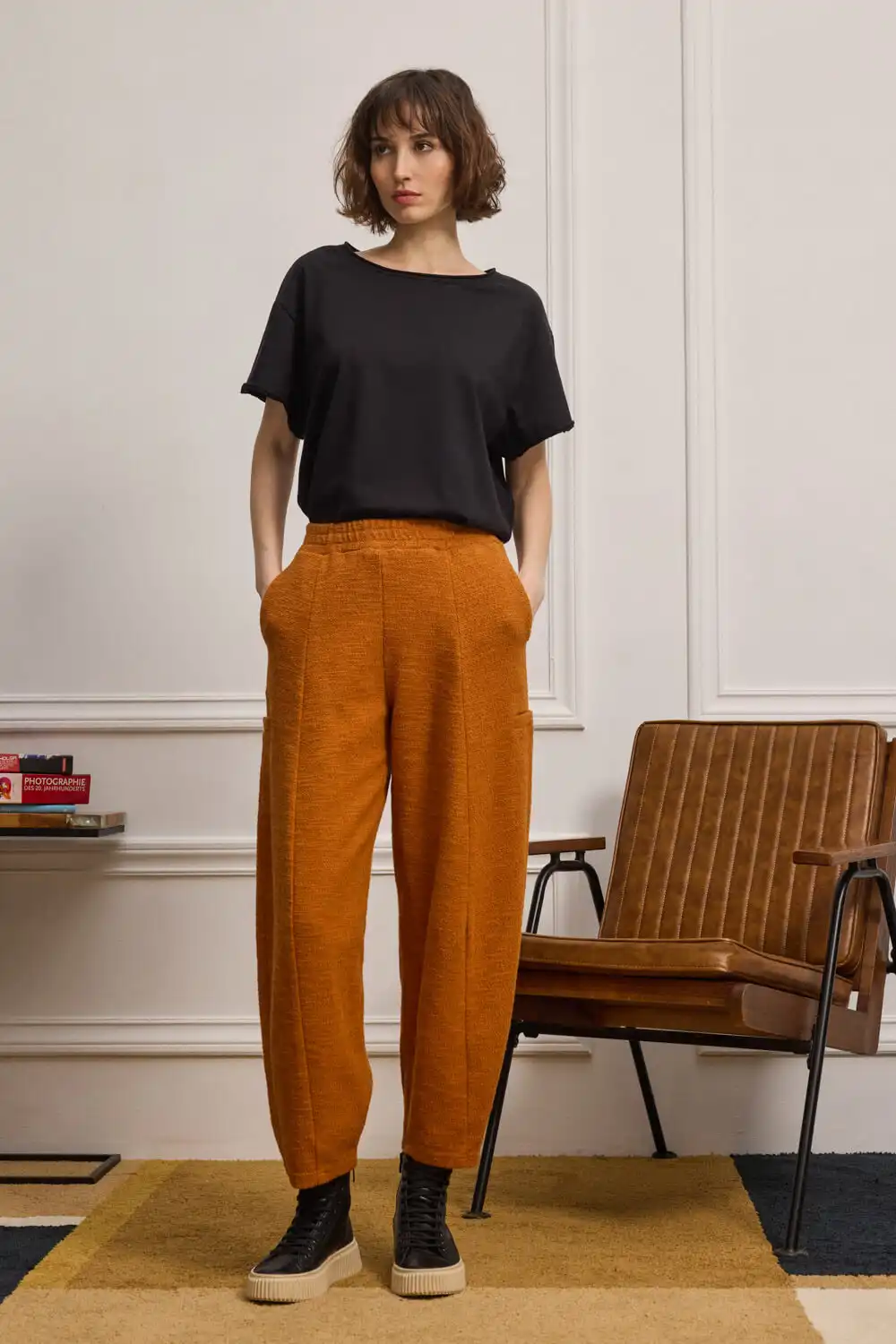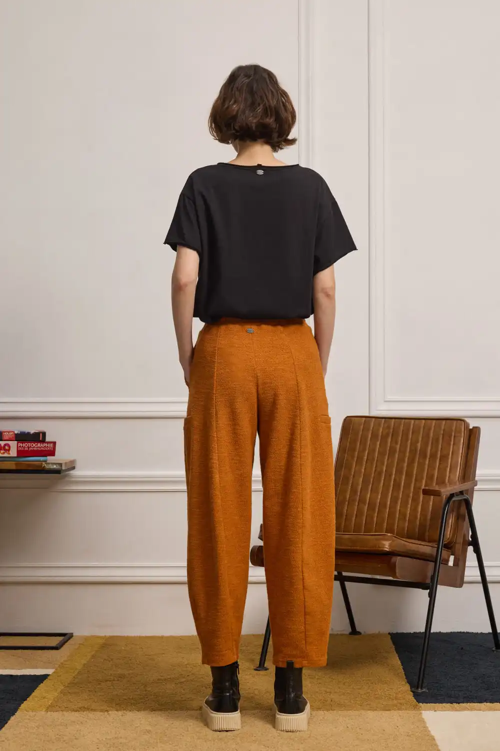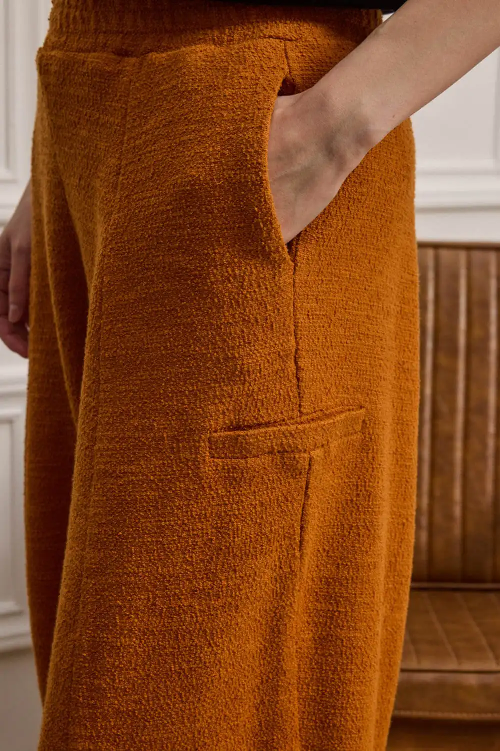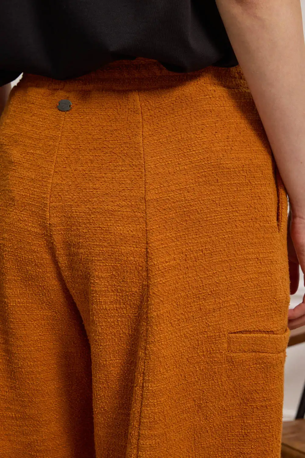 Cropped παντελόνι-φόρμα σε μπουκλέ φούτερ ύφασμα, με ιδιαίτερη υφή και προσεγμένες λεπτομέρειες. Διαθέτει λάστιχο στη μέση για άνετη και σταθερή εφαρμογή, ενώ το κάθετο κόψιμο μπροστά και πίσω επιμηκύνει οπτικά τη σιλουέτα, προσφέροντας πιο δομημένη εμφάνιση. Τα διακοσμητικά φιλέτα στα πλαϊνά προσθέτουν ξεχωριστό χαρακτήρα στο σχέδιο. Συνδυάζεται άψογα με το φούτερ BARTOLI, δημιουργώντας ένα δυναμικό και στιλάτο σύνολο που κάνει εντύπωση.