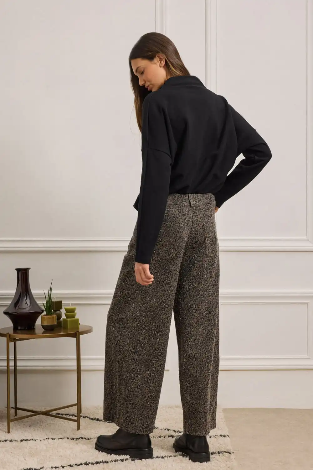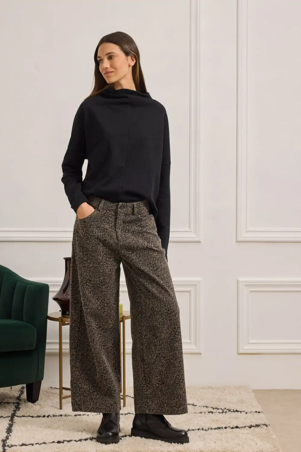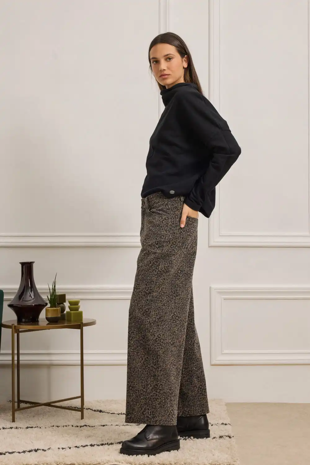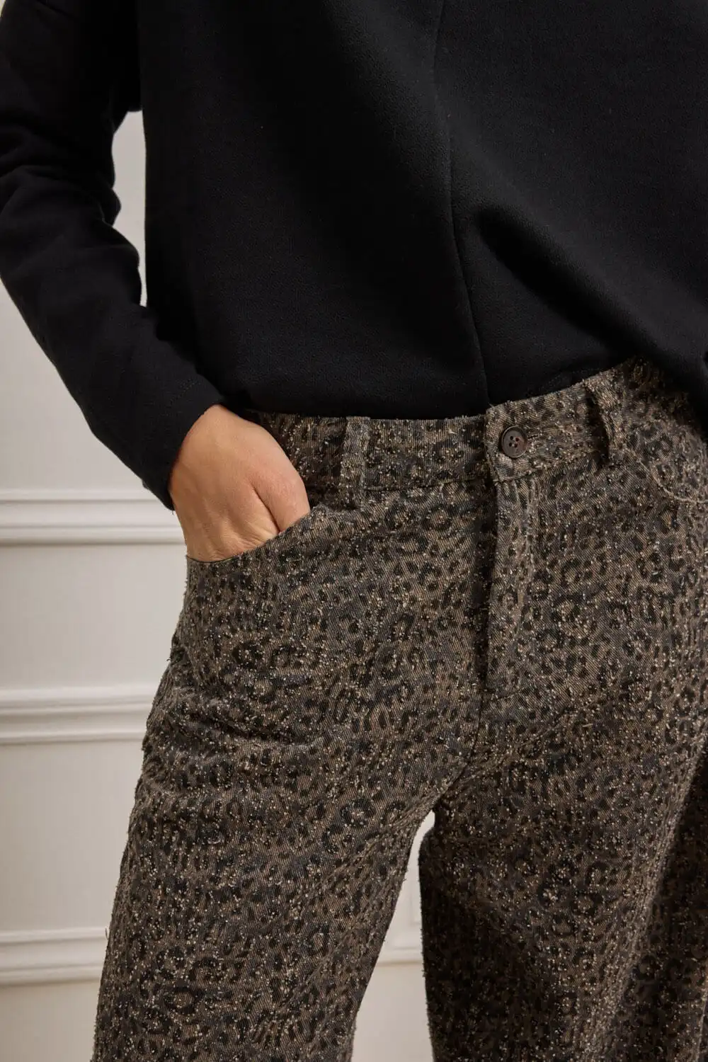 Παντελόνι σε ίσια, ελαφρώς cropped γραμμή με animal print και διακριτική ανάγλυφη υφή, που προσδίδει έντονη fashion ταυτότητα. Διαθέτει κλασικό κλείσιμο με κουμπί και φερμουάρ, θηλάκια για ζώνη και πέντε λειτουργικές τσέπες, αναδεικνύοντας τον urban χαρακτήρα του. Η υφή του υφάσματος συνδυάζει κομψότητα και τόλμη, καθιστώντας το ιδανική επιλογή για εμφανίσεις που ξεχωρίζουν.