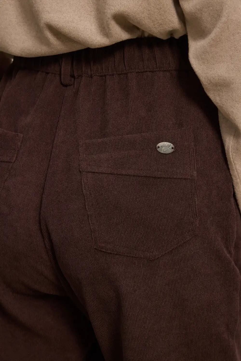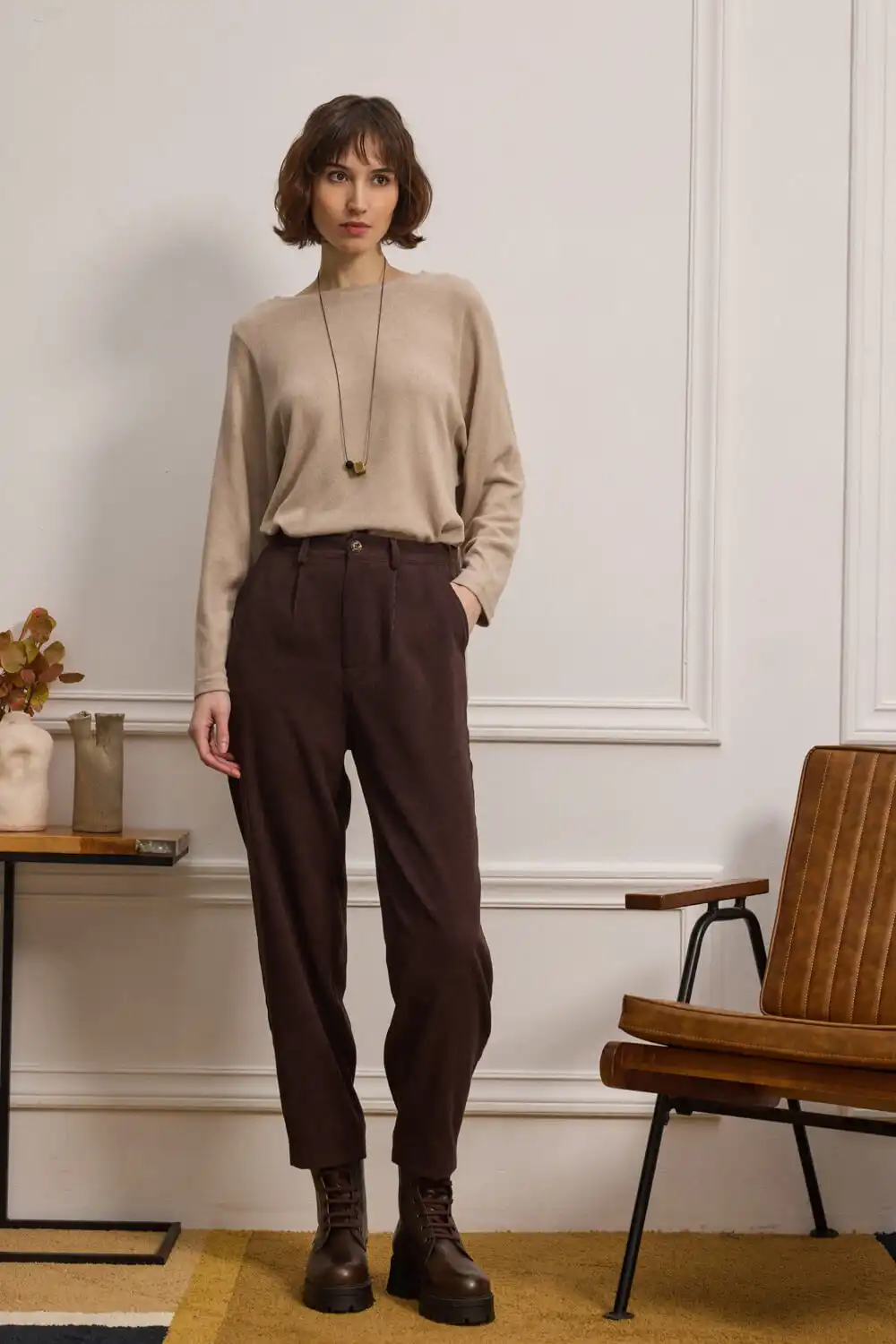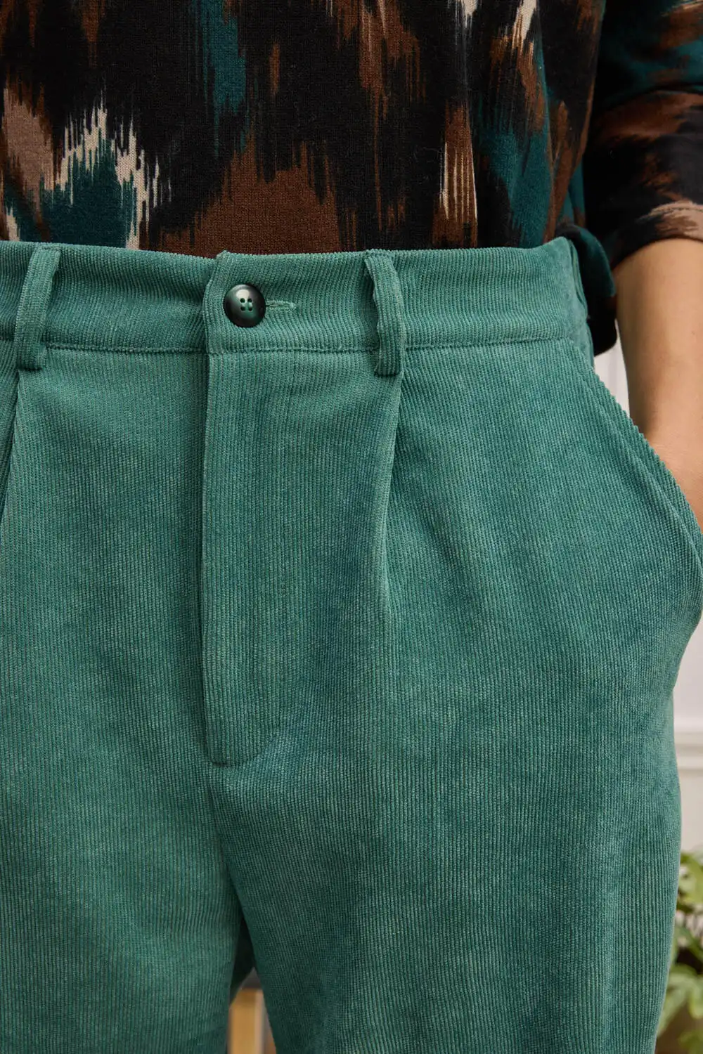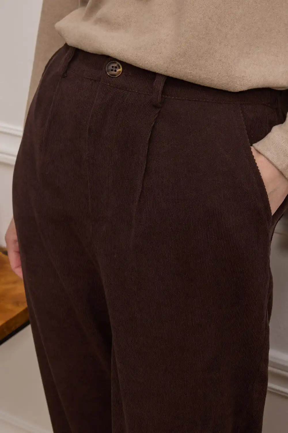 Κλασικό και διαχρονικό παντελόνι με σύγχρονη αισθητική, κατασκευασμένο από απαλό κοτλέ ύφασμα που χαρίζει βάθος και διακριτική ελαστικότητα, εξασφαλίζοντας άνεση στην κίνηση. Διαθέτει ψηλόμεση γραμμή που αγκαλιάζει τη μέση, πιέτες μπροστά για δομή και λάστιχο στο πίσω μέρος για τέλεια εφαρμογή. Το τελείωμα με πένσες δημιουργεί ελαφρώς tapered γραμμή, ενώ οι πλαϊνές και πίσω τσέπες με διακριτικό φινίρισμα, καθώς και τα θυλάκια για ζώνη, ολοκληρώνουν το κομμάτι. Το μπροστινό κλείσιμο γίνεται με κουμπί και φερμουάρ.