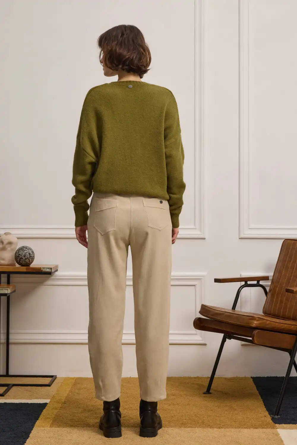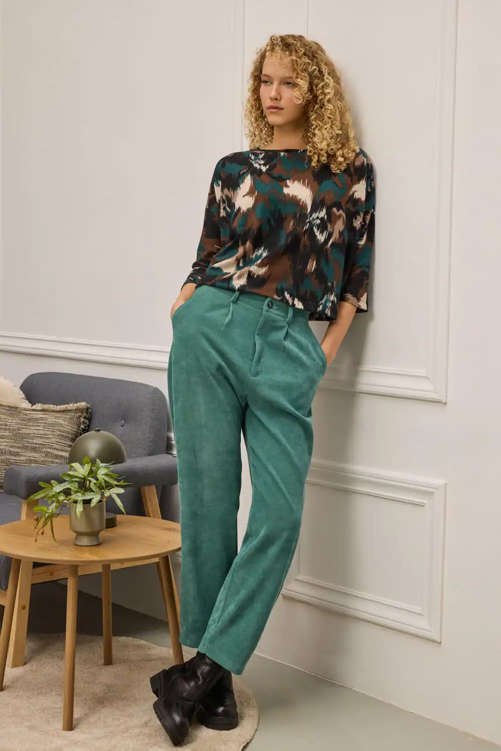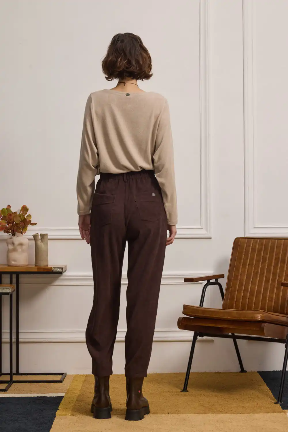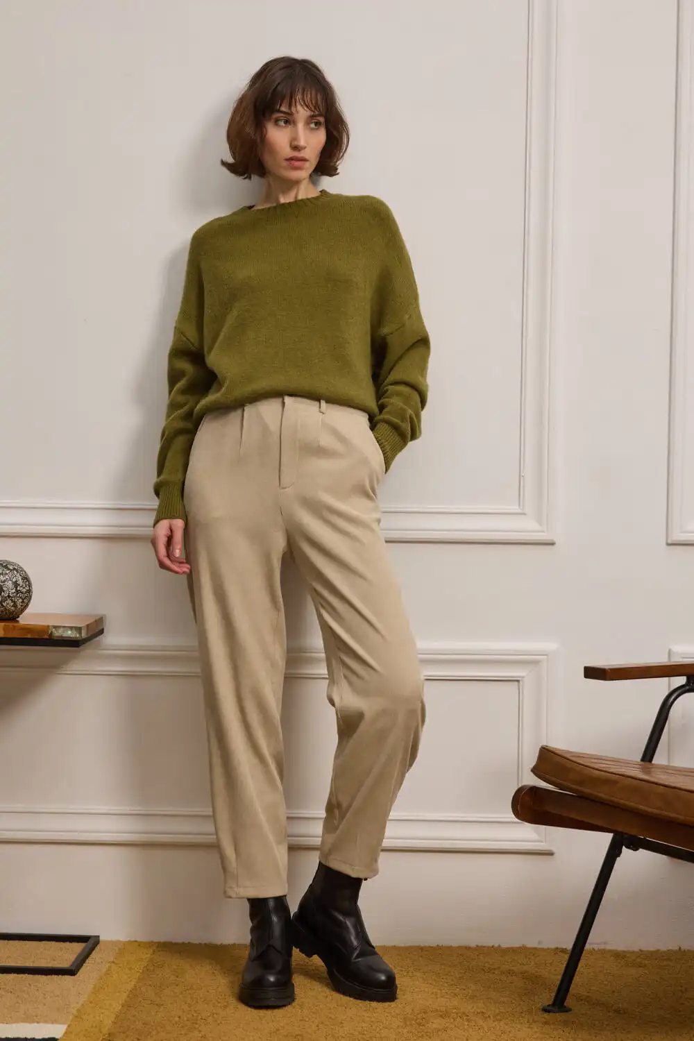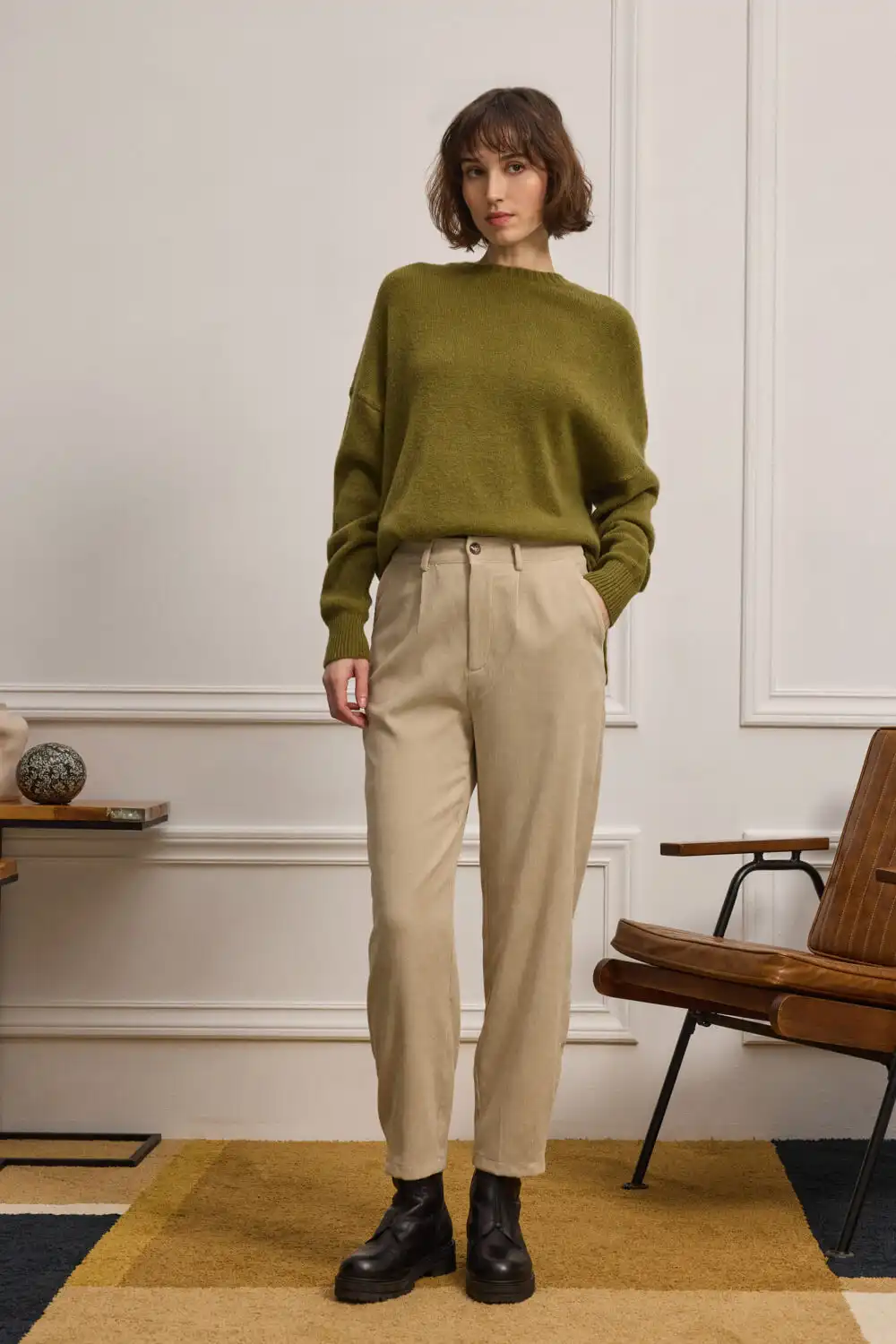 Κλασικό και διαχρονικό παντελόνι με σύγχρονη αισθητική, κατασκευασμένο από απαλό κοτλέ ύφασμα που χαρίζει βάθος και διακριτική ελαστικότητα, εξασφαλίζοντας άνεση στην κίνηση. Διαθέτει ψηλόμεση γραμμή που αγκαλιάζει τη μέση, πιέτες μπροστά για δομή και λάστιχο στο πίσω μέρος για τέλεια εφαρμογή. Το τελείωμα με πένσες δημιουργεί ελαφρώς tapered γραμμή, ενώ οι πλαϊνές και πίσω τσέπες με διακριτικό φινίρισμα, καθώς και τα θυλάκια για ζώνη, ολοκληρώνουν το κομμάτι. Το μπροστινό κλείσιμο γίνεται με κουμπί και φερμουάρ.