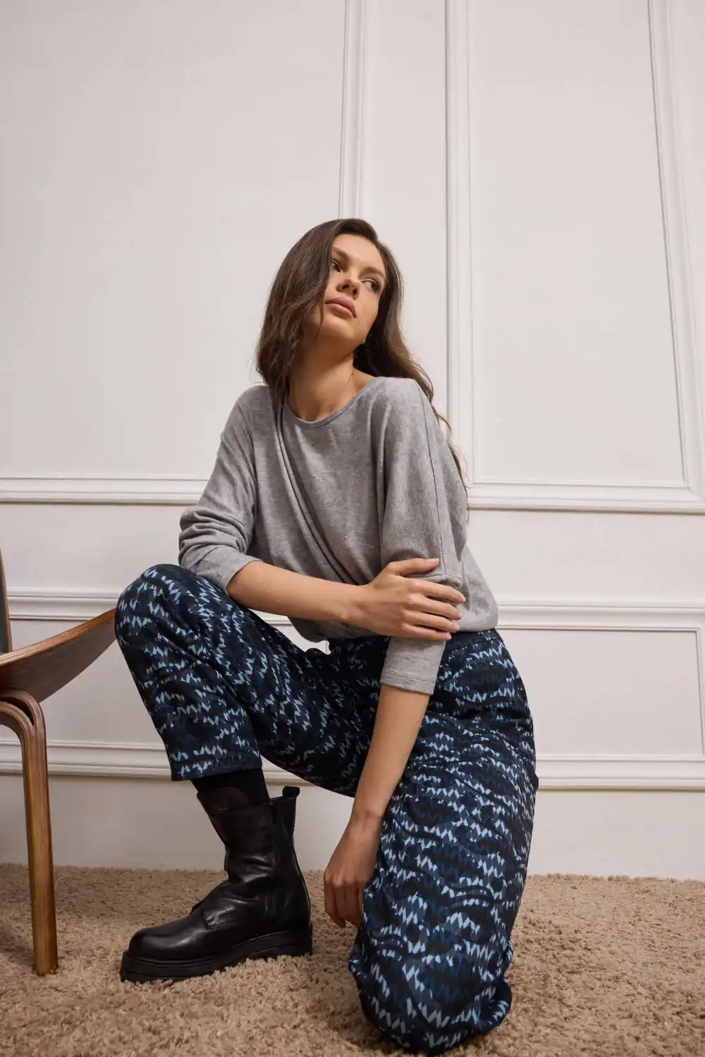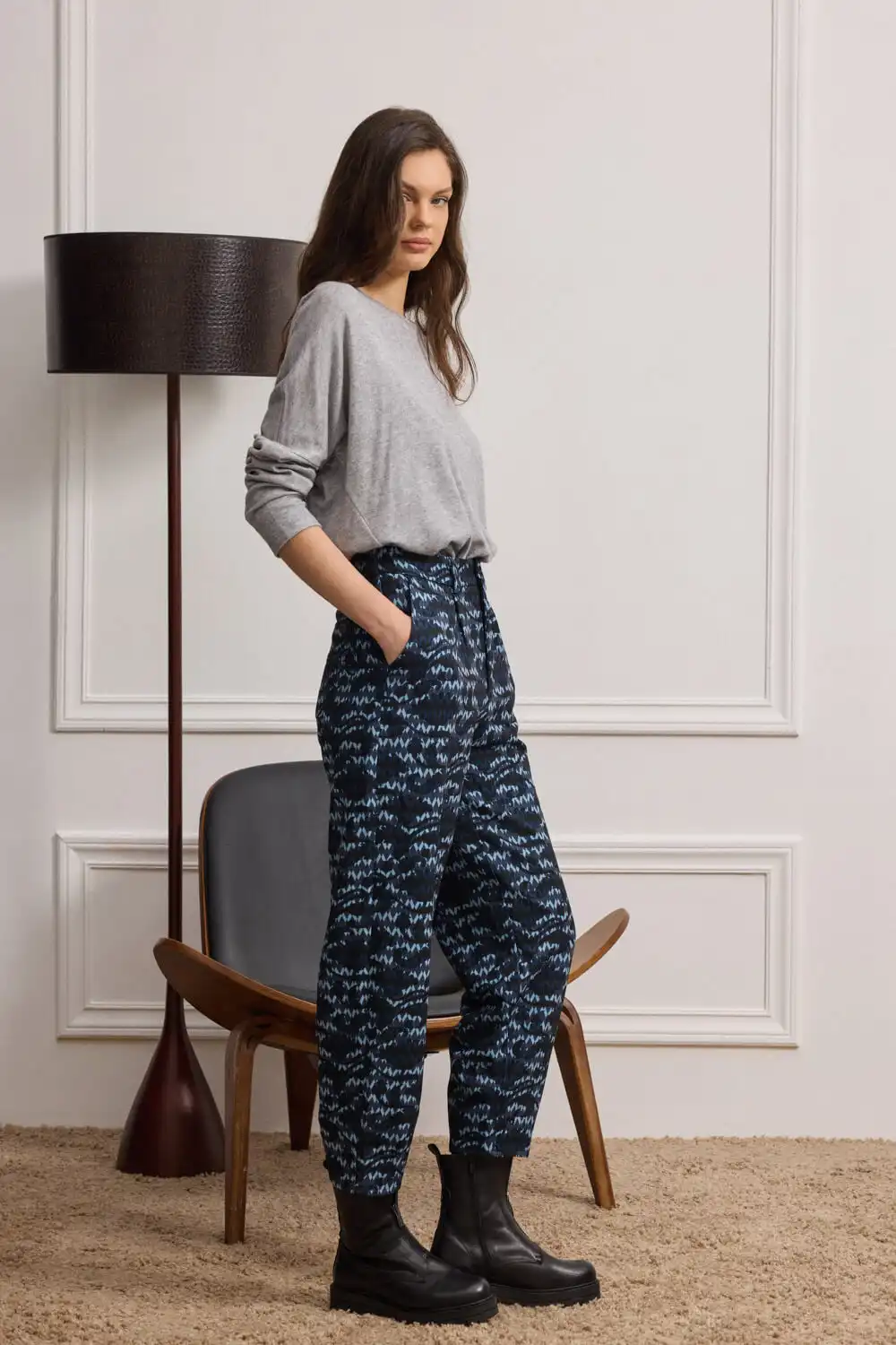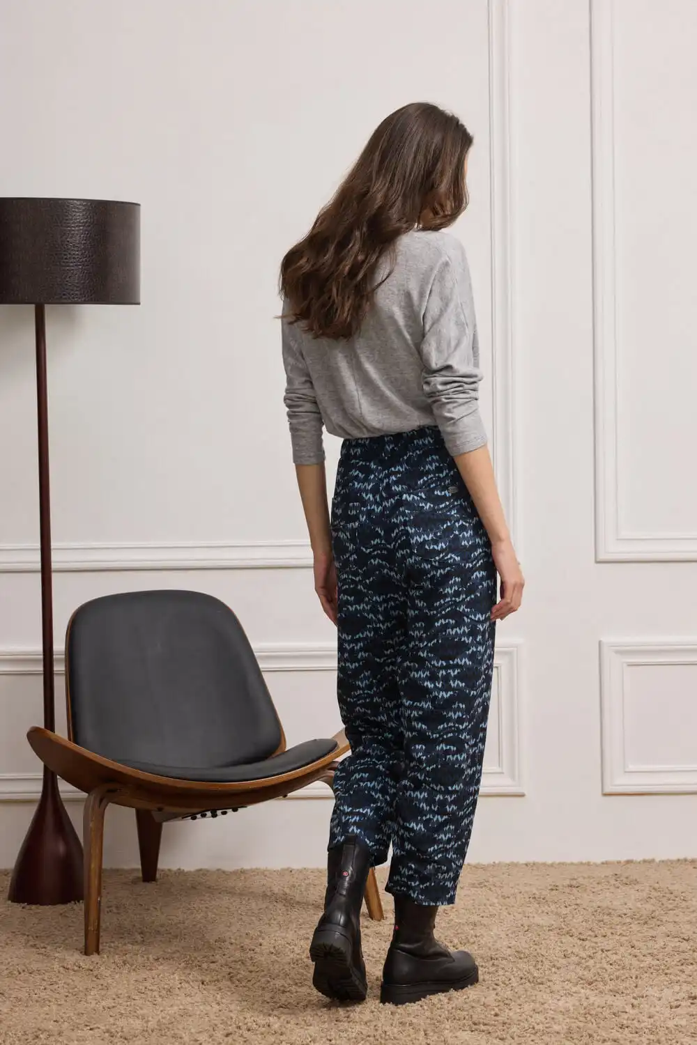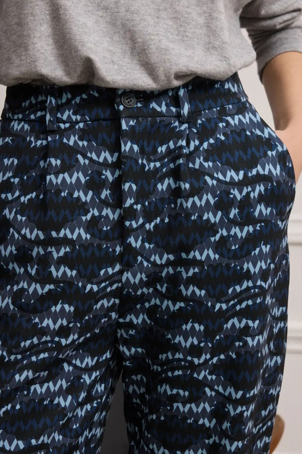 Παντελόνι με έντονο γεωμετρικό print και relaxed εφαρμογή, προσφέροντας μια πιο τολμηρή και σύγχρονη προσέγγιση στο καθημερινό ντύσιμο. Το μοτίβο αναπτύσσεται σε ρυθμικές, γεωμετρικές επαναλήψεις, δημιουργώντας δυναμική οπτική ταυτότητα. Η ίσια γραμμή του στενεύει διακριτικά προς τον αστράγαλο, αναδεικνύοντας το cropped μήκος και διαμορφώνοντας μια φρέσκια, ισορροπημένη σιλουέτα. Διαθέτει μπροστινό κλείσιμο με φερμουάρ και κουμπί, πρακτικά θυλάκια για ζώνη, κοφτές τσέπες μπροστά και τετράγωνες τσέπες πίσω. Το εντυπωσιακό print λειτουργεί ως κεντρικό σχεδιαστικό στοιχείο, αναβαθμίζοντας κάθε look ακόμη και στους πιο απλούς συνδυασμούς.