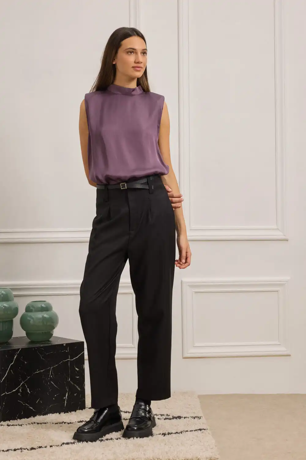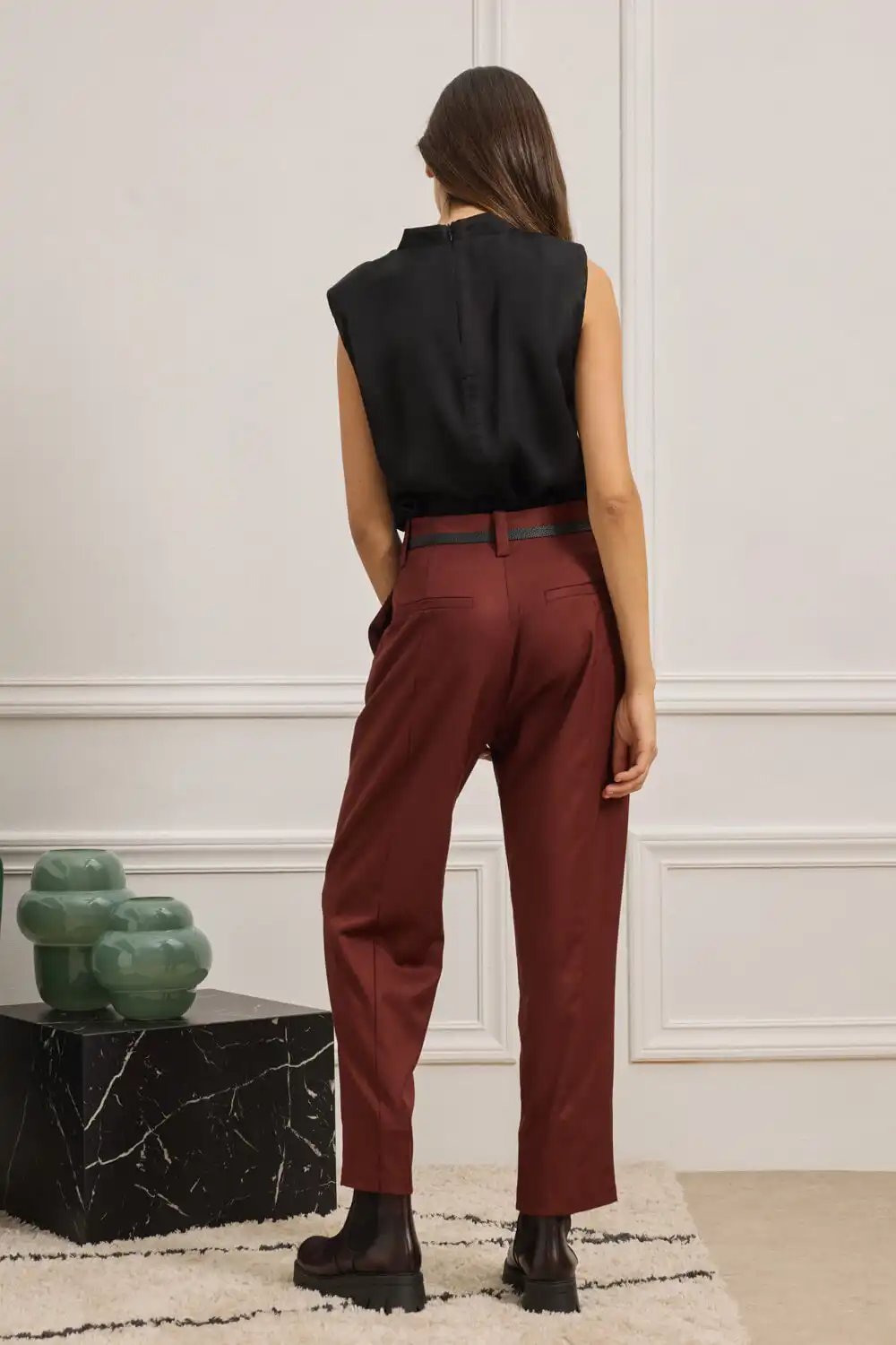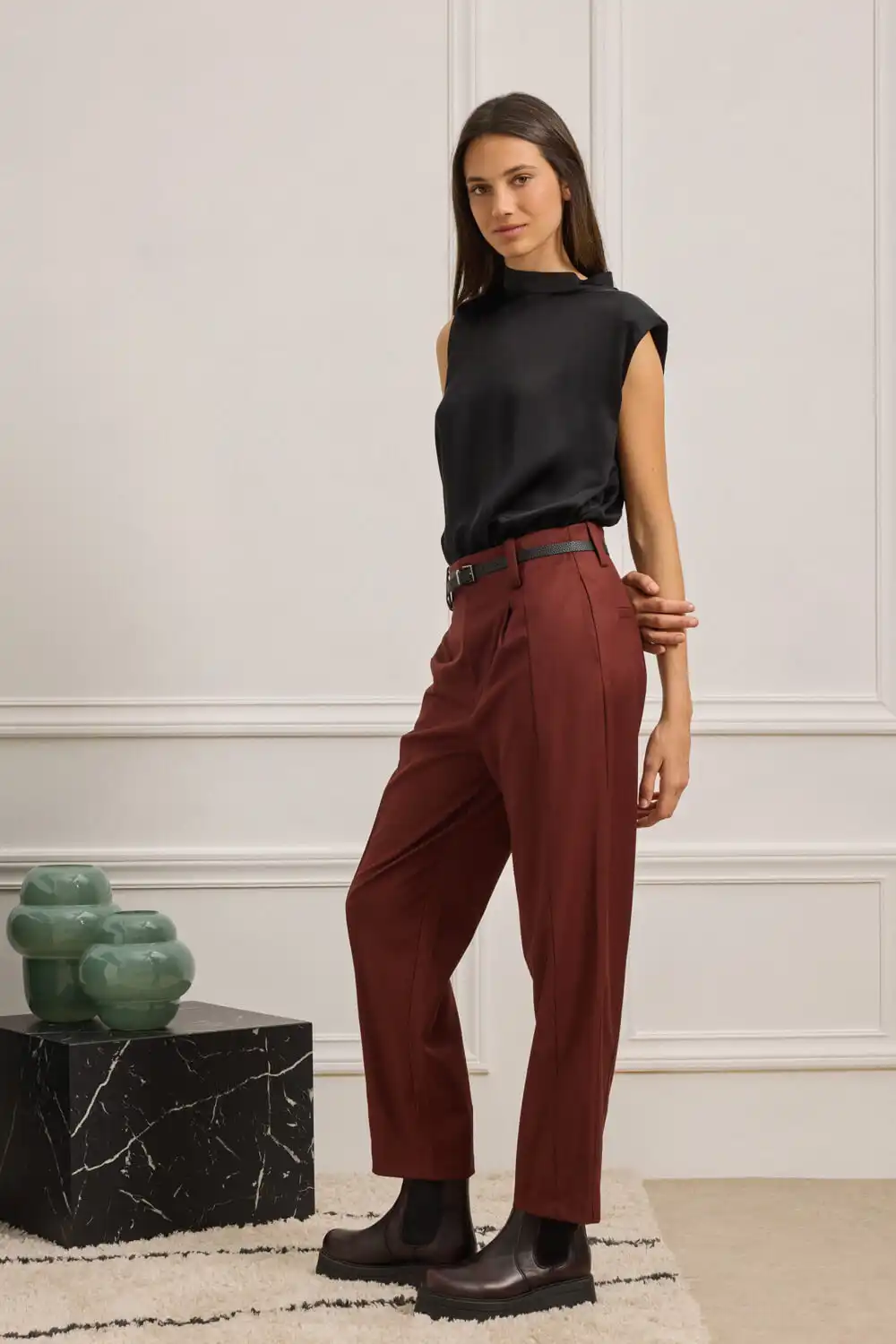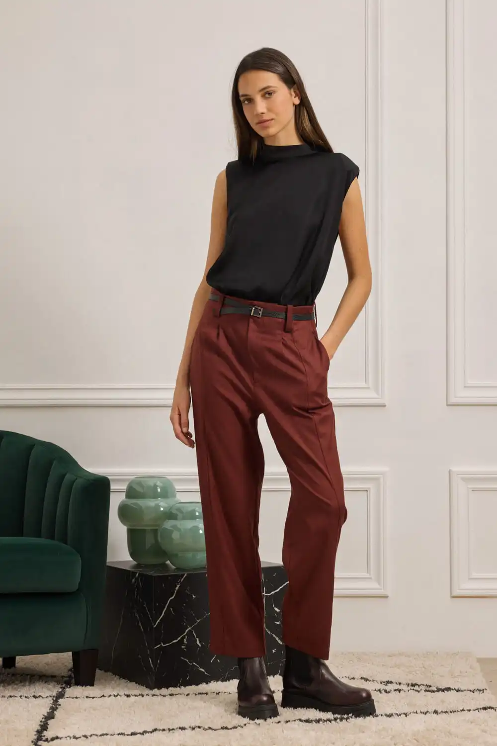 Ψηλόμεσο παντελόνι σε ίσια γραμμή, με κομψή και διαχρονική αισθητική που αναδεικνύει τη σιλουέτα μέσα από προσεγμένες λεπτομέρειες. Οι διακριτικές πιέτες μπροστά προσφέρουν δομή και καθαρότητα στο design, ενώ οι πλαϊνές τσέπες και τα διακοσμητικά φιλέτα στο πίσω μέρος ενισχύουν τον tailored χαρακτήρα του. Κλείνει με φερμουάρ και εσωτερικό κουμπί, εξασφαλίζοντας άνετη και σταθερή εφαρμογή. Η ζώνη με μεταλλική αγκράφα ολοκληρώνει το σύνολο, προσθέτοντας μια εκλεπτυσμένη, elegant νότα.