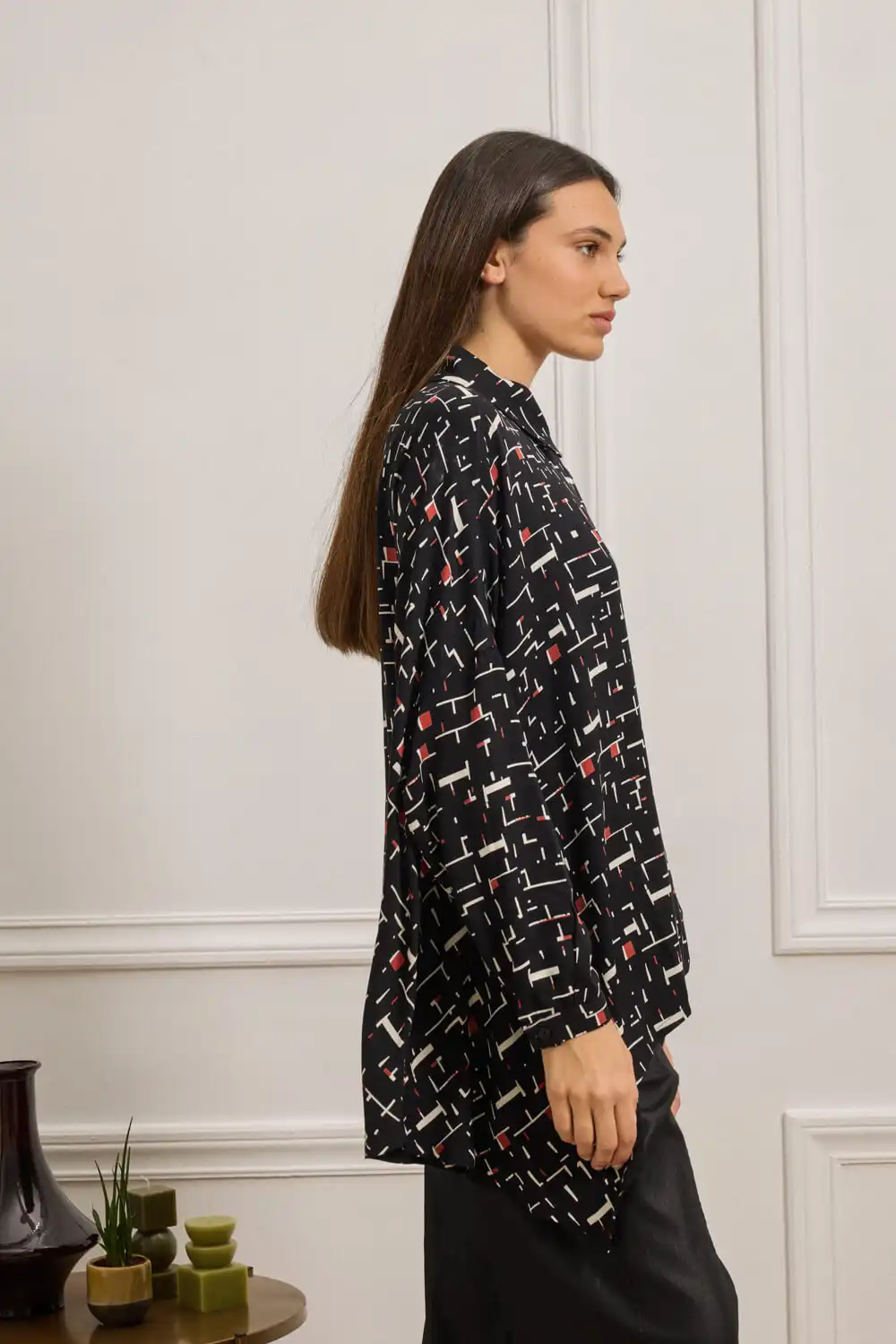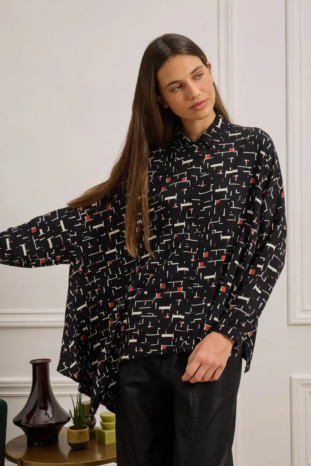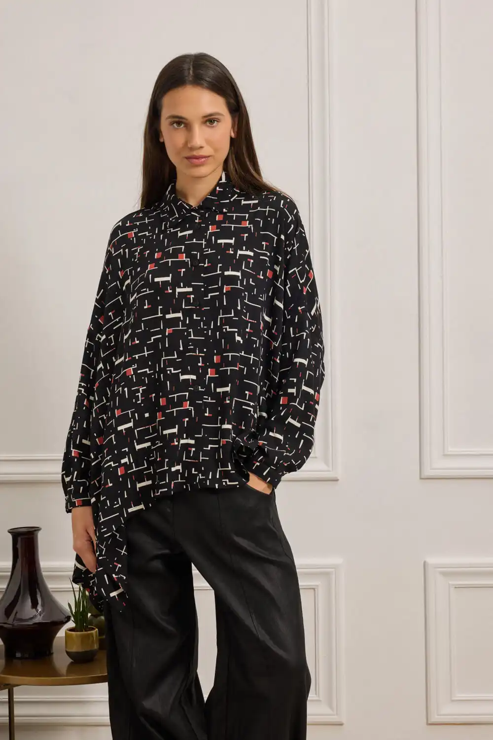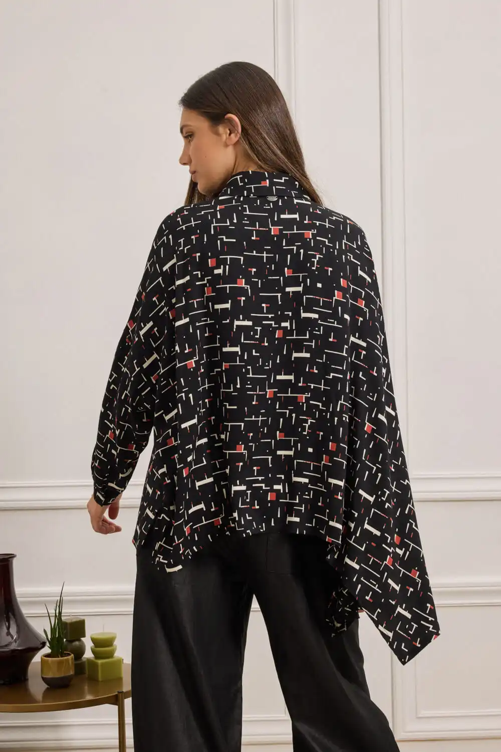 Oversized πουκάμισο με γεωμετρικό print, κατασκευασμένο από 100% Viscose EcoVero, που προσφέρει ανάλαφρη υφή και φυσική κίνηση. Διαθέτει κλασικό γιακά, ζαπονέ μακριά μανίκια που καταλήγουν σε μανσέτα με κουμπί, καθώς και μπροστινό κλείσιμο με κουμπιά. Το ασύμμετρο τελείωμα, με μυτερή λεπτομέρεια στη μία πλευρά, προσθέτει σχεδιαστικό ενδιαφέρον και ξεχωριστή ταυτότητα. Συνδυάζεται άψογα με τη φούστα DUA, δημιουργώντας ένα statement σετ με έντονο χαρακτήρα. Αυτό το προϊόν έχει δημιουργηθεί με σεβασμό στο περιβάλλον, χρησιμοποιώντας φυσικές ίνες.