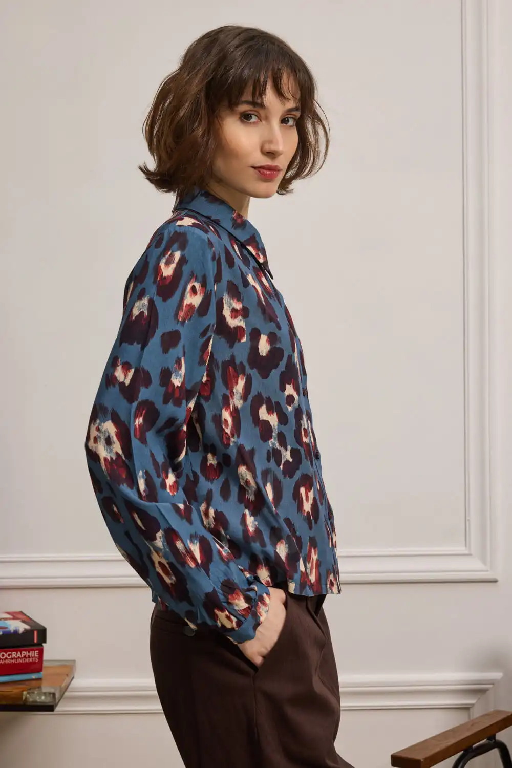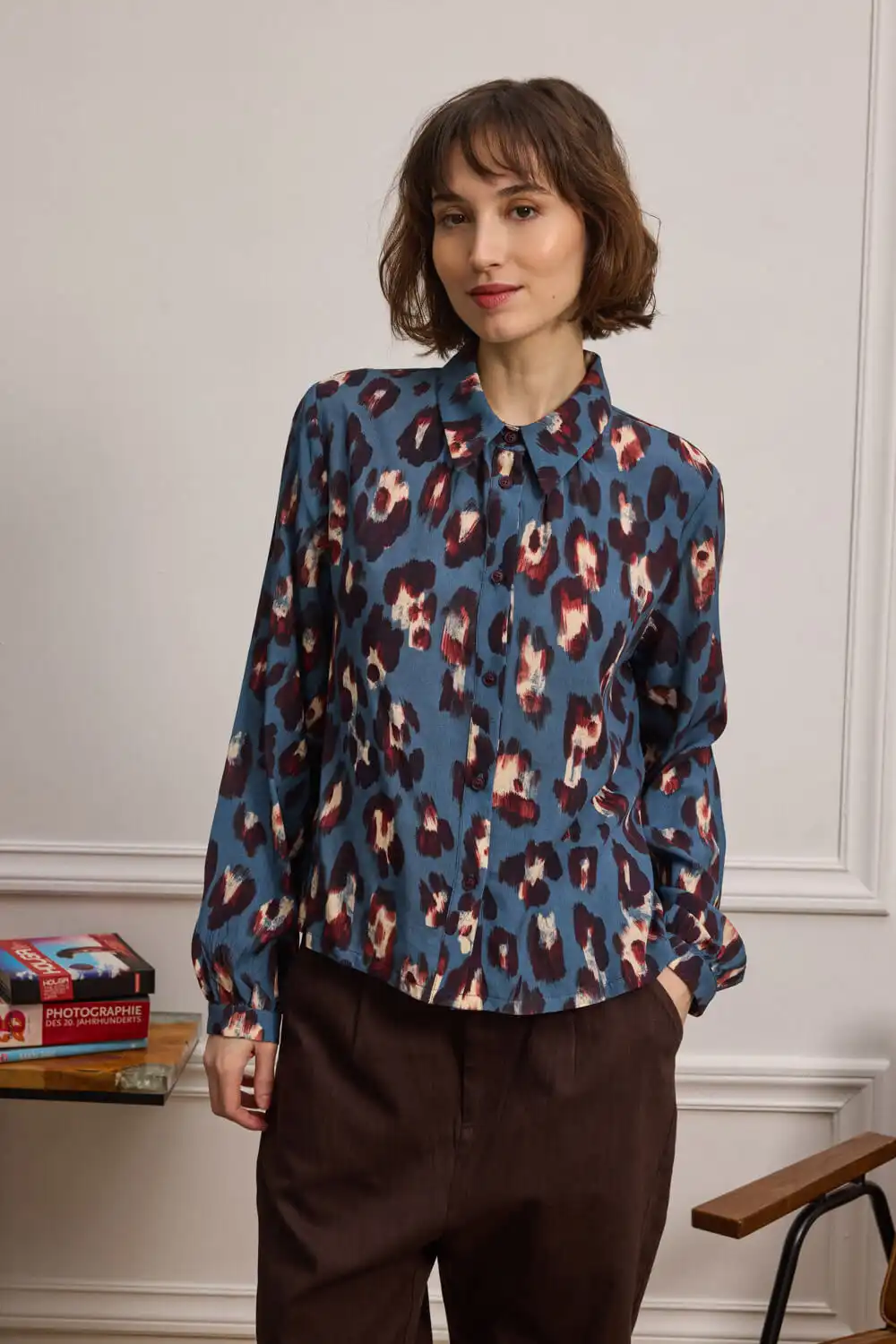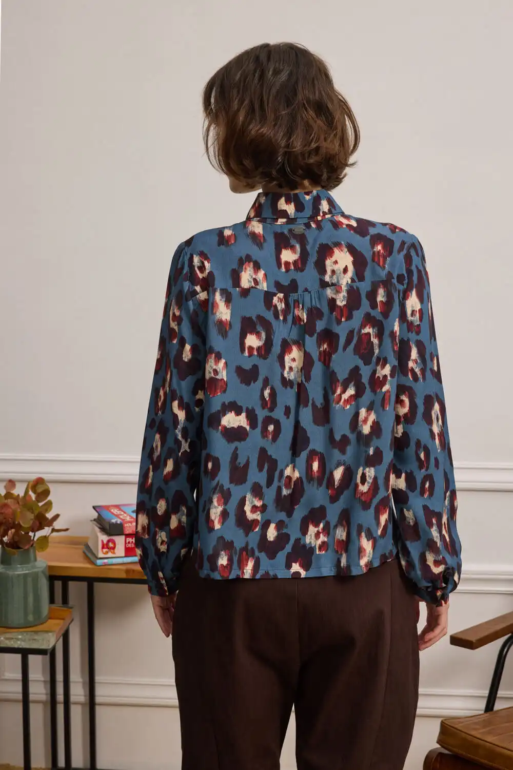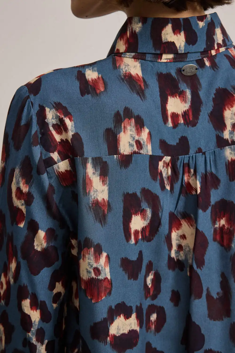 Πουκάμισο με έντονο animal print, κατασκευασμένο από 100% viscose, με απαλή και άνετη υφή. Η χαλαρή γραμμή του συνδυάζει κλασικό γιακά και μακριά μανίκια που καταλήγουν σε μανσέτες με κουμπί, προσδίδοντας κομψότητα και διακριτική δομή. Το μπροστινό κλείσιμο με κουμπιά ολοκληρώνει το σχέδιο. Ένα statement piece που συνδυάζει άνεση με δυναμική αισθητική. Αυτό το προϊόν έχει δημιουργηθεί με σεβασμό στο περιβάλλον, χρησιμοποιώντας φυσικές ίνες.