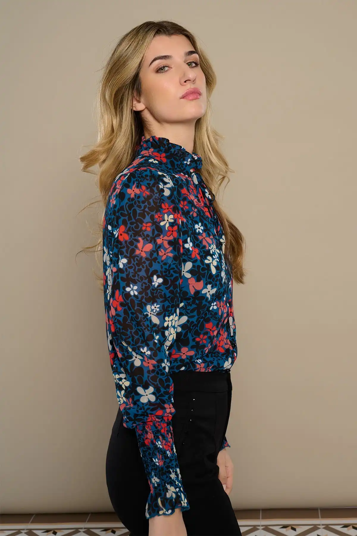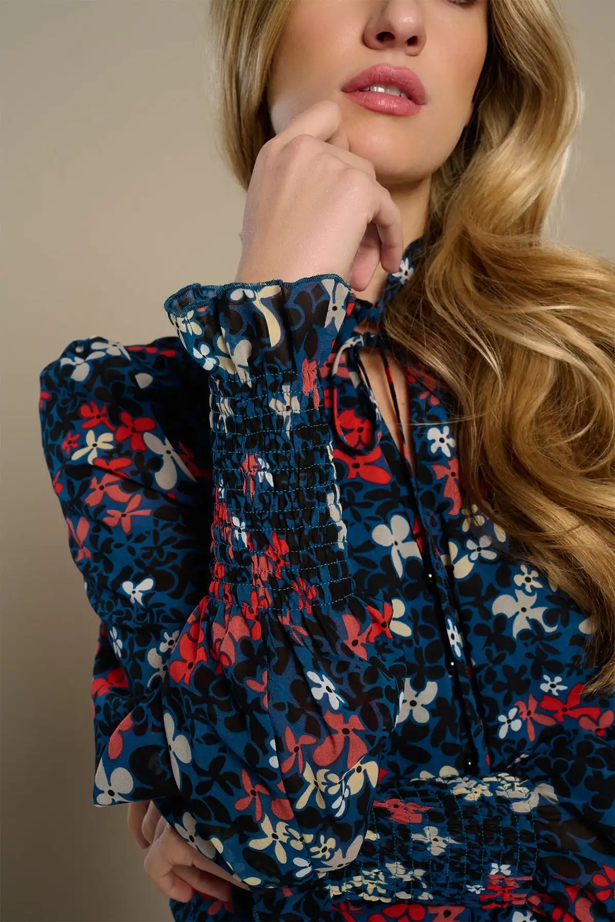 Εμπριμέ σχέδιο με λουλούδια σε μπλε, λευκούς και κόκκινους τόνους.