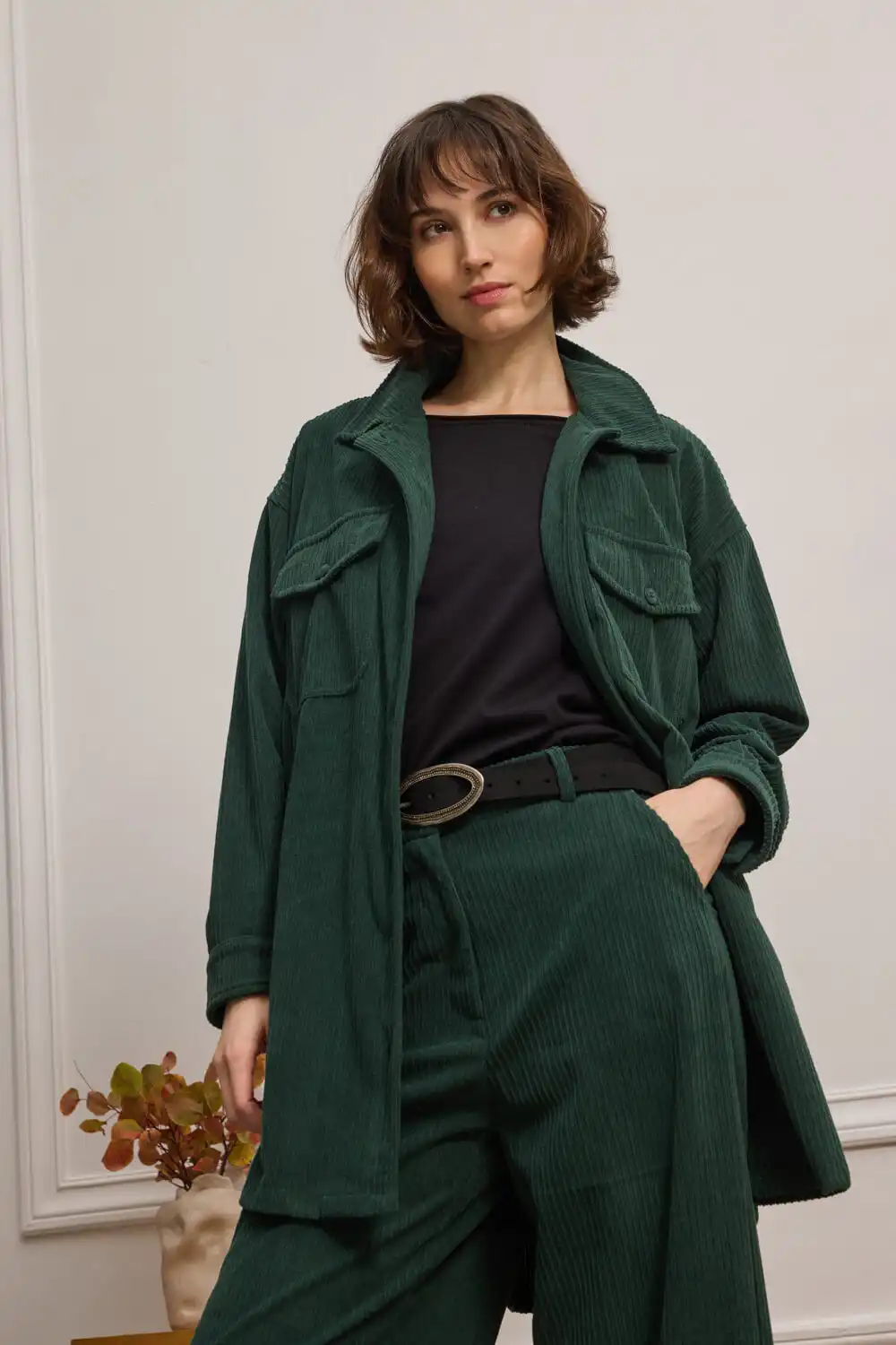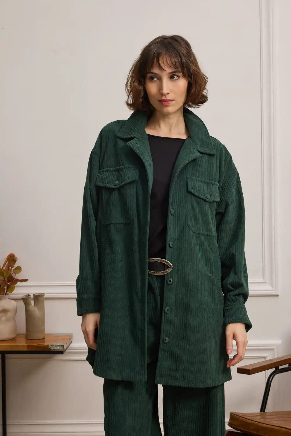 Overshirt από απαλή κοτλέ υφή, σε χαλαρή γραμμή για άνετη εφαρμογή. Διαθέτει κλασικό γιακά, μπροστινό κλείσιμο με κουμπιά και μακριά μανίκια με μανσέτα και κουμπί. Οι δύο τσέπες με καπάκι στο στήθος και οι κάθετες τσέπες στο πλάι ενισχύουν τη λειτουργικότητα του σχεδίου. Η κάθετη ανάγλυφη υφή προσδίδει βάθος και ενδιαφέρον, ενώ η χαλαρή γραμμή αναδεικνύει ένα σύγχρονο, effortless look.