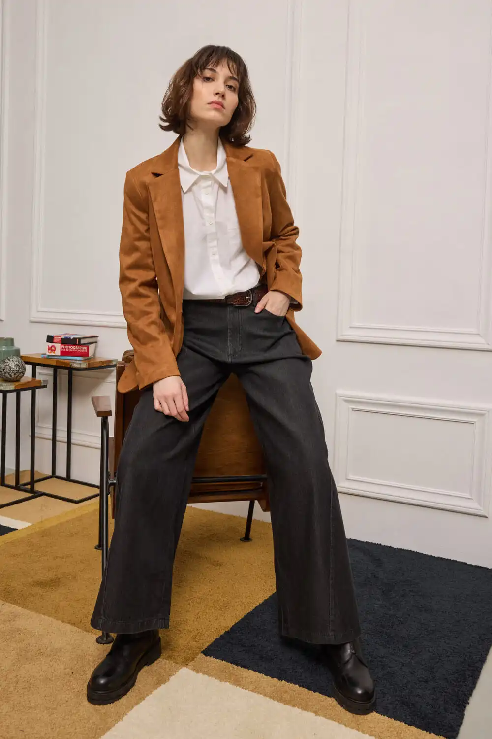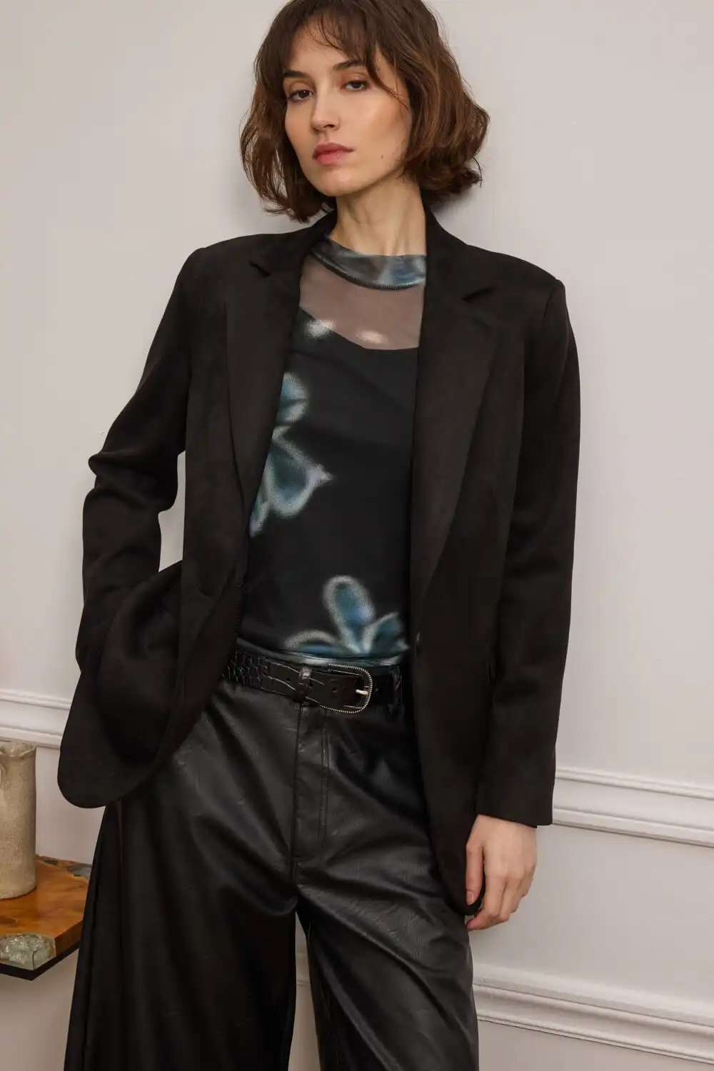 Κλασικό σακάκι από ύφασμα με suede υφή, που συνδυάζει μοντέρνο twist με premium αισθητική. Το μονόκουμπο κλείσιμο ενσωματώνει τη διαχρονική κομψότητα με σύγχρονη δυναμική. Διαθέτει ελαφρώς μεσάτη γραμμή και διακριτικά τονισμένη μέση, αναδεικνύοντας τη σιλουέτα χωρίς να χάνει τη δομή του. Ο γιακάς με πέτο, τα μακριά μανίκια με ενισχυμένους ώμους και οι τσέπες με καπάκι συνδυάζουν στοιχεία utility με tailored χαρακτήρα, δημιουργώντας αρμονική ισορροπία ανάμεσα σε στυλ και λειτουργικότητα.