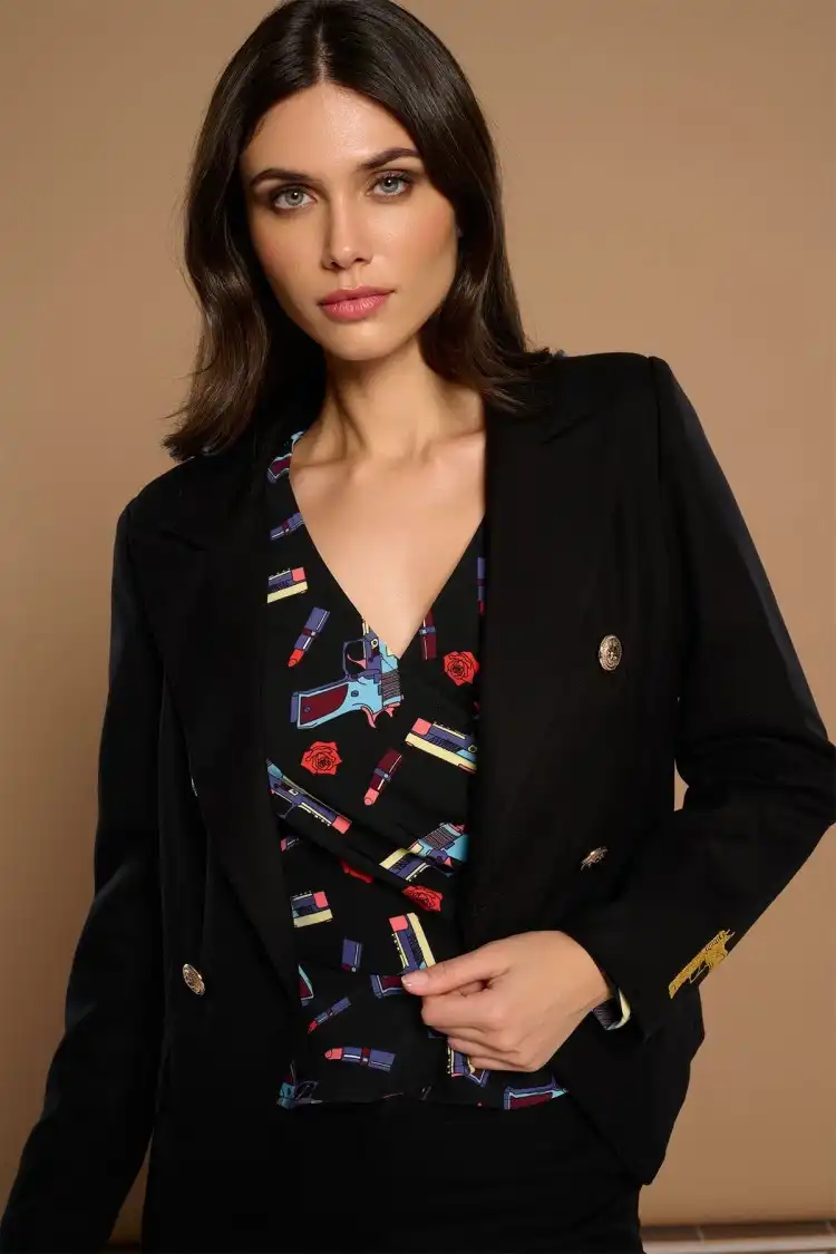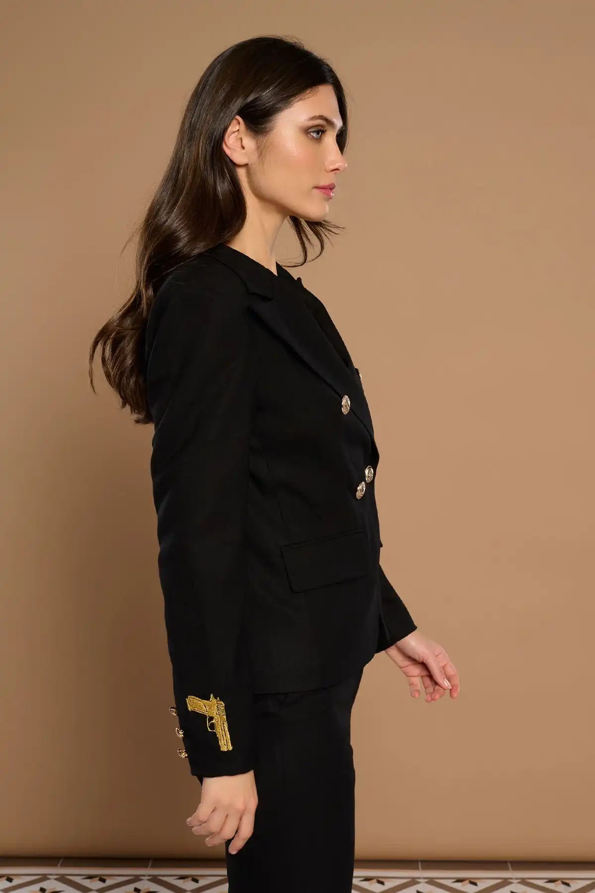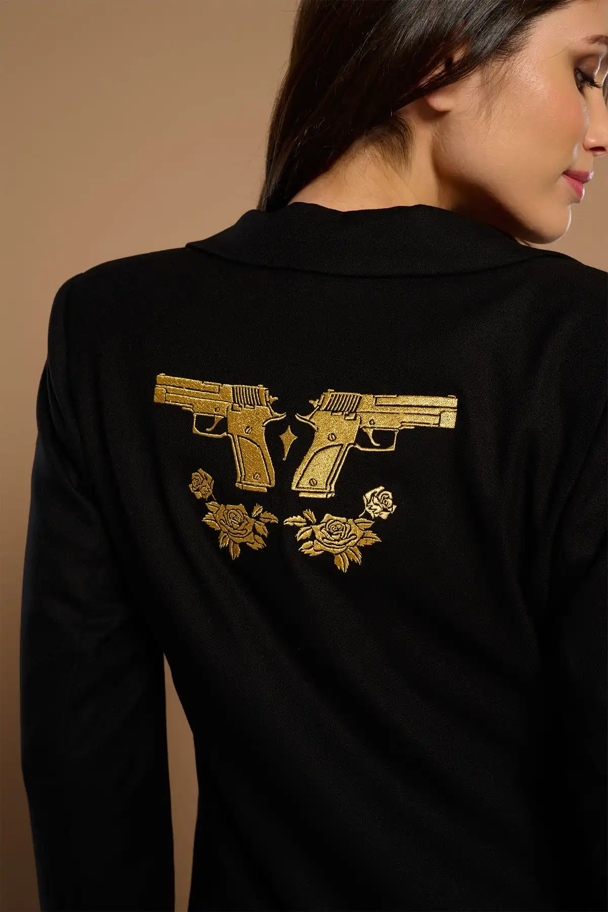 Σακάκι blazer με κεντητό σχέδιο “Guns, Roses & Lipstick” σε χρυσό στις μανσέτες.