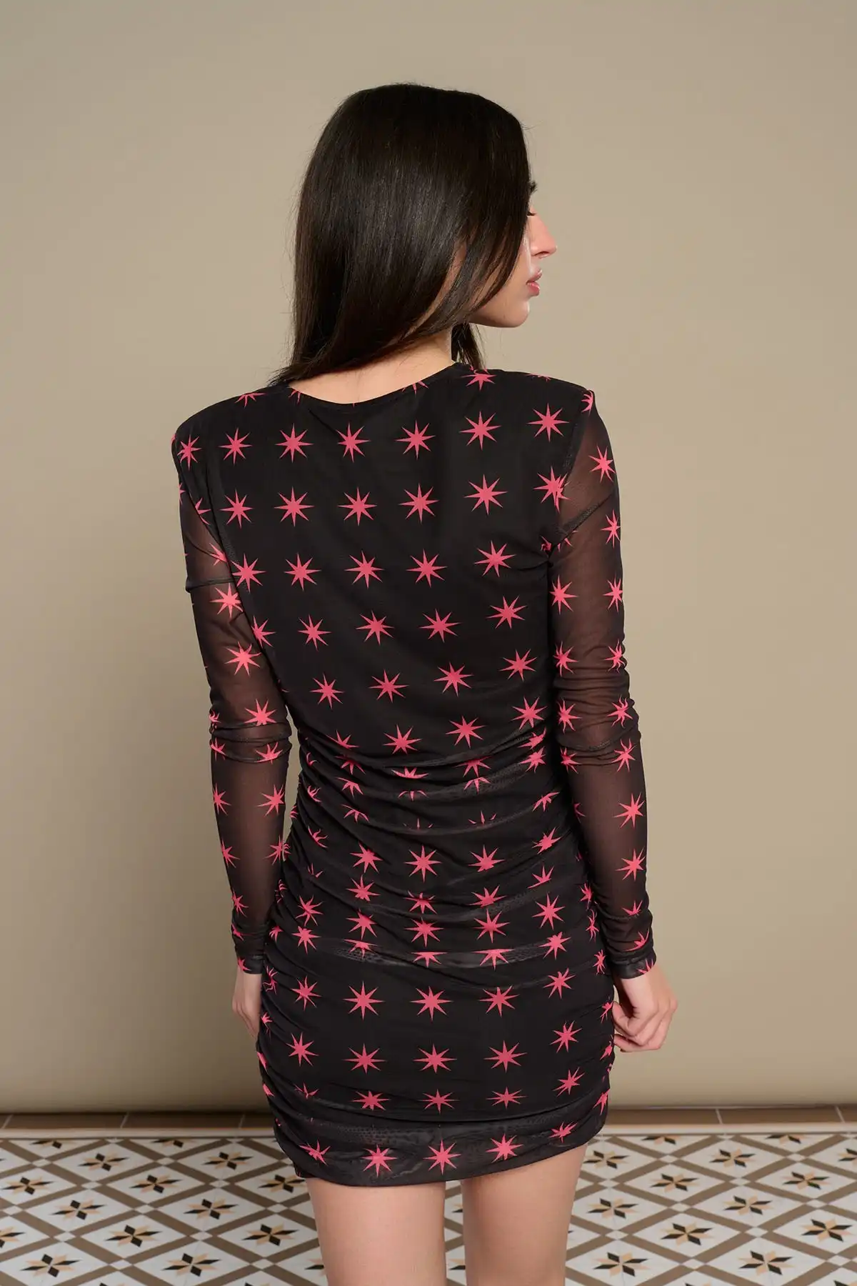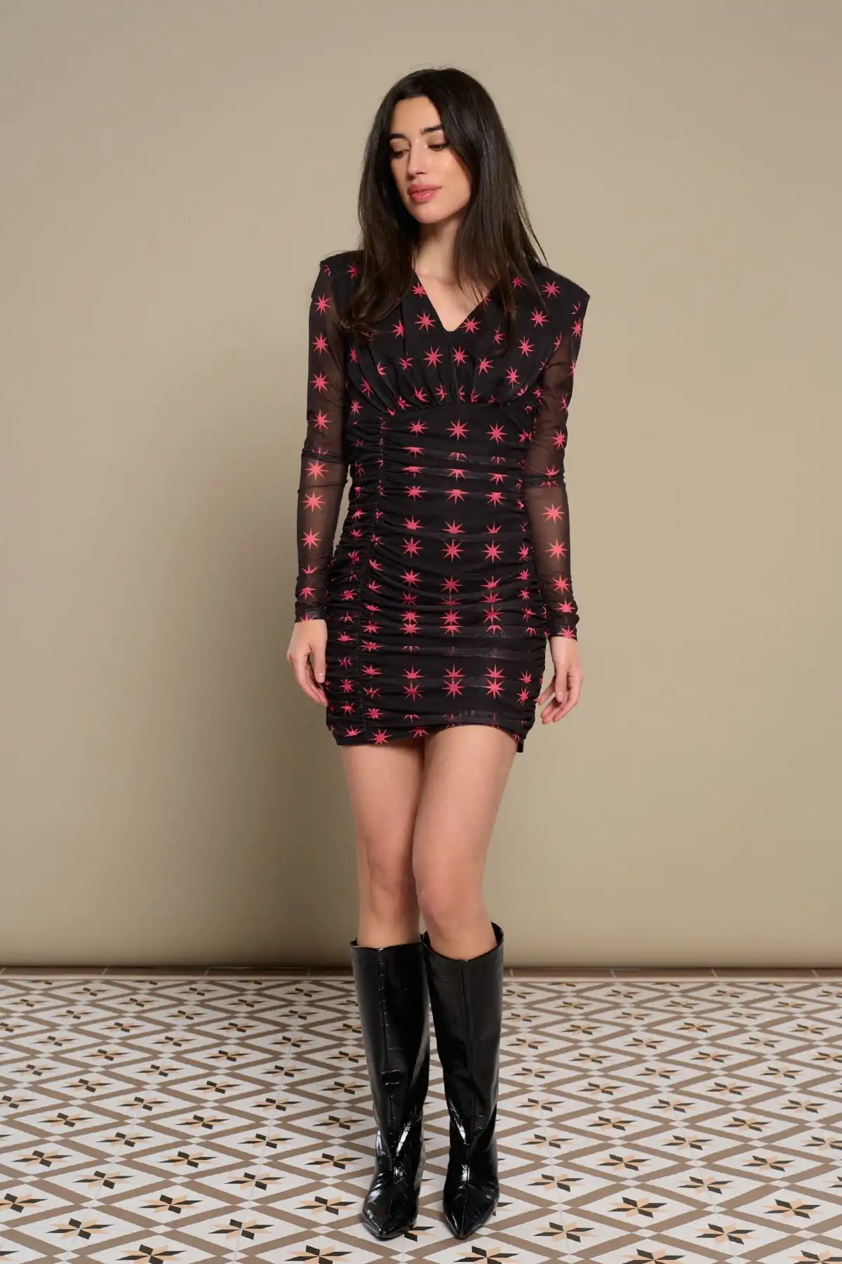 Κοντό φόρεμα με λαιμόκοψη V και μακριά μανίκια με τιράντες στους ώμους.