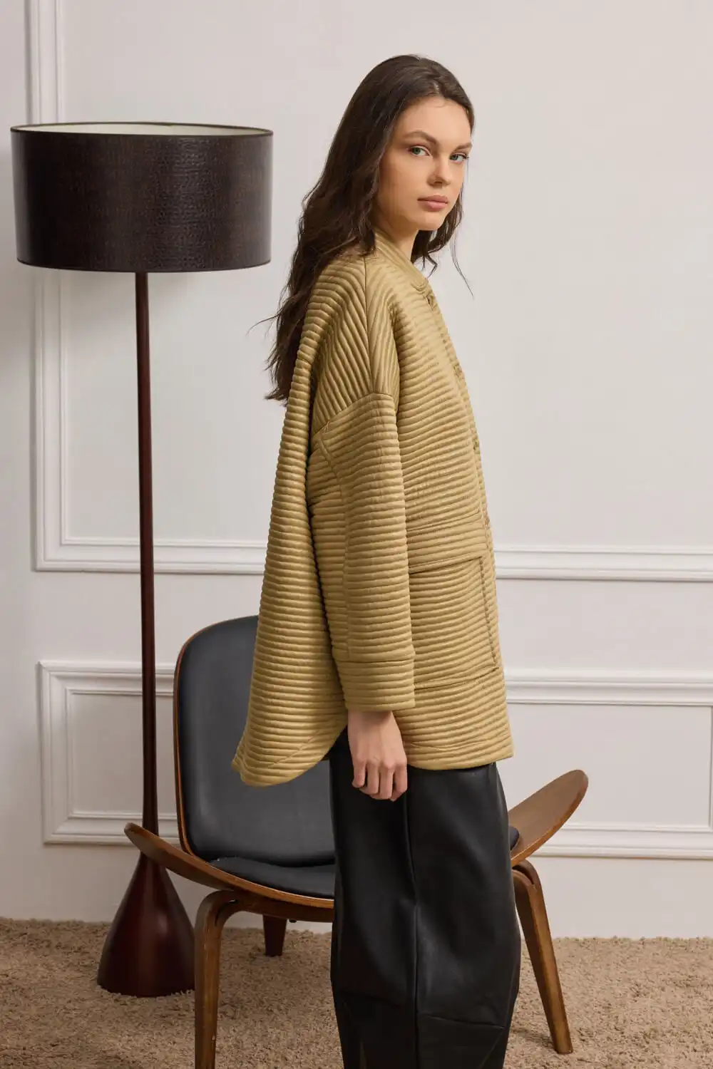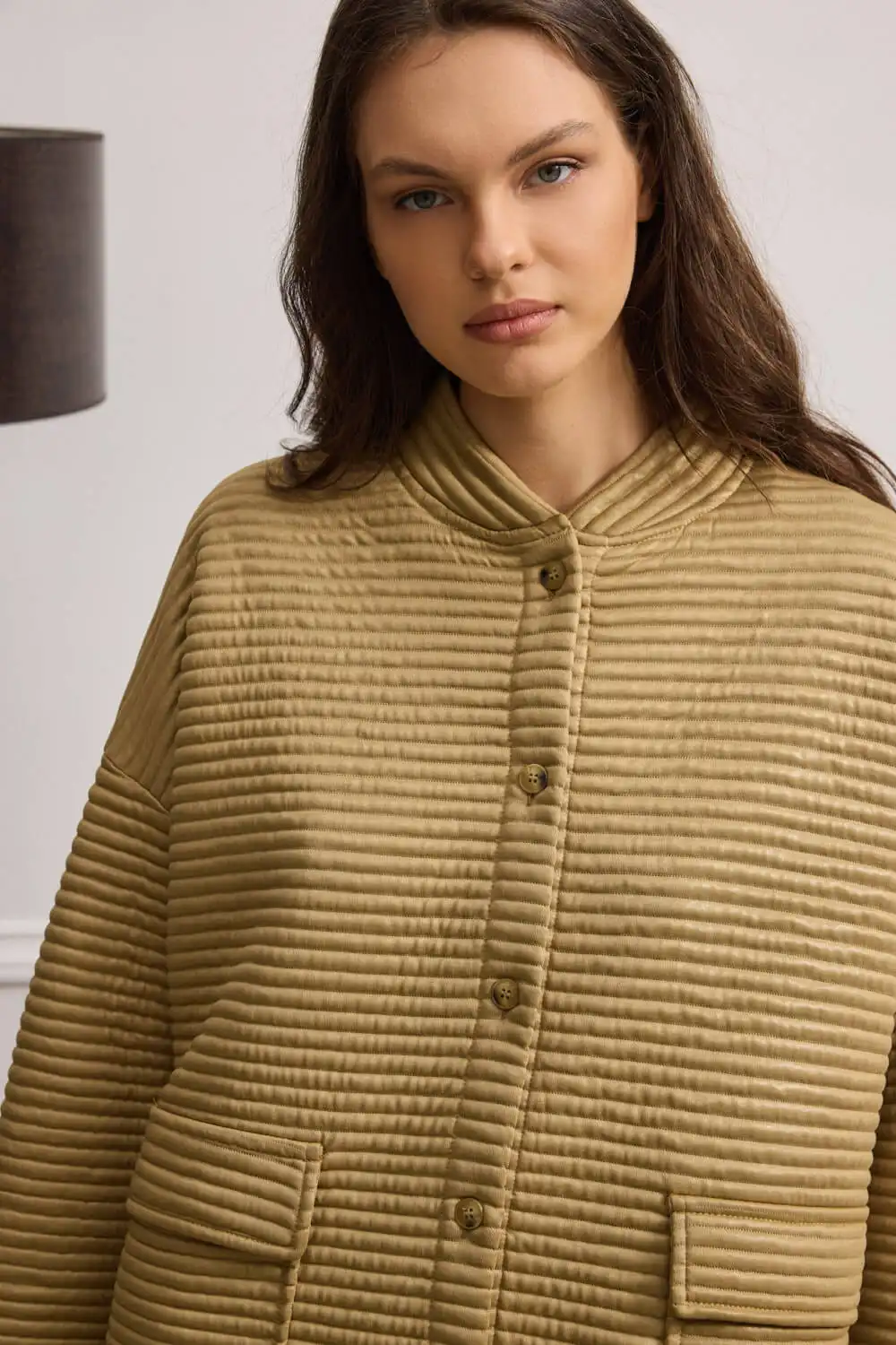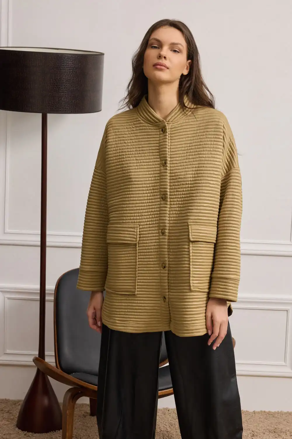 Overshirt-ζακέτα με μακριά μανίκια και εντυπωσιακό σχεδιασμό. Ένα κομμάτι που συνδυάζει άνεση και στιλ, ιδανικό για layering. Ο όρθιος γιακάς αγκαλιάζει διακριτικά τον λαιμό, προσφέροντας μοντέρνα δομή, ενώ το κλείσιμο με πατιλέτα και κουμπιά χαρίζει καθαρές γραμμές και κομψό φινίρισμα. Οι εξωτερικές τσέπες με καπάκι προσφέρουν πρακτικότητα και urban χαρακτήρα. Το ελαφρώς γυαλιστερό καπιτονέ ύφασμα προσδίδει διακριτική λάμψη, ενώ η oversized γραμμή ολοκληρώνει ένα casual και σύγχρονο look.